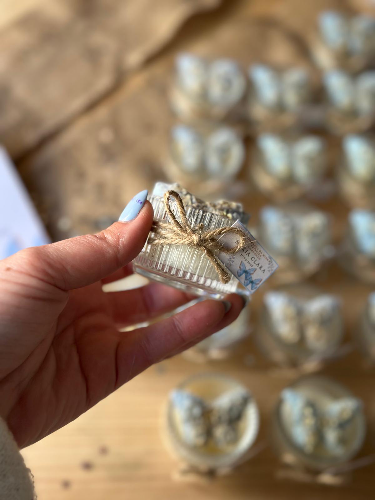• Caixas transparentes com borboletas decorativas azuis e brancas e etiquetas MARIA CLARA