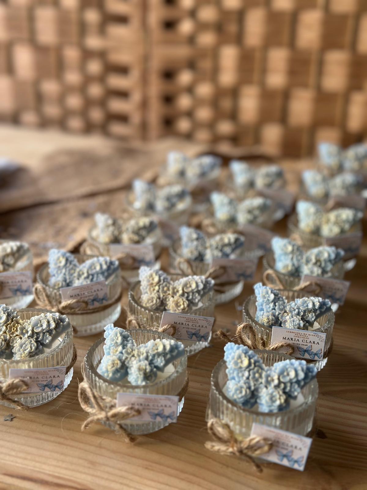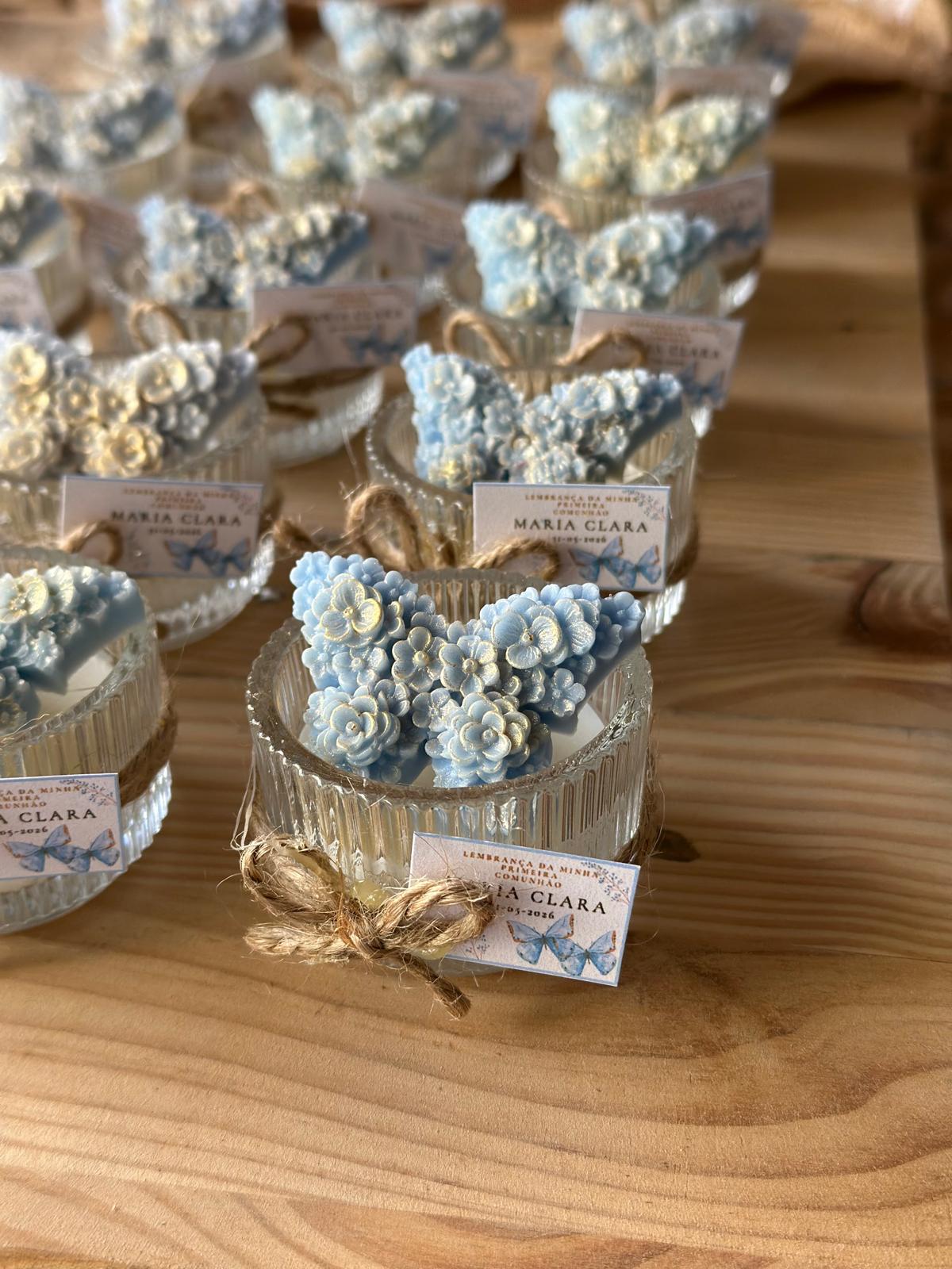 • Recipientes de vidro com borboletas floridas azuis e etiquetas para lembrança de comunhão.