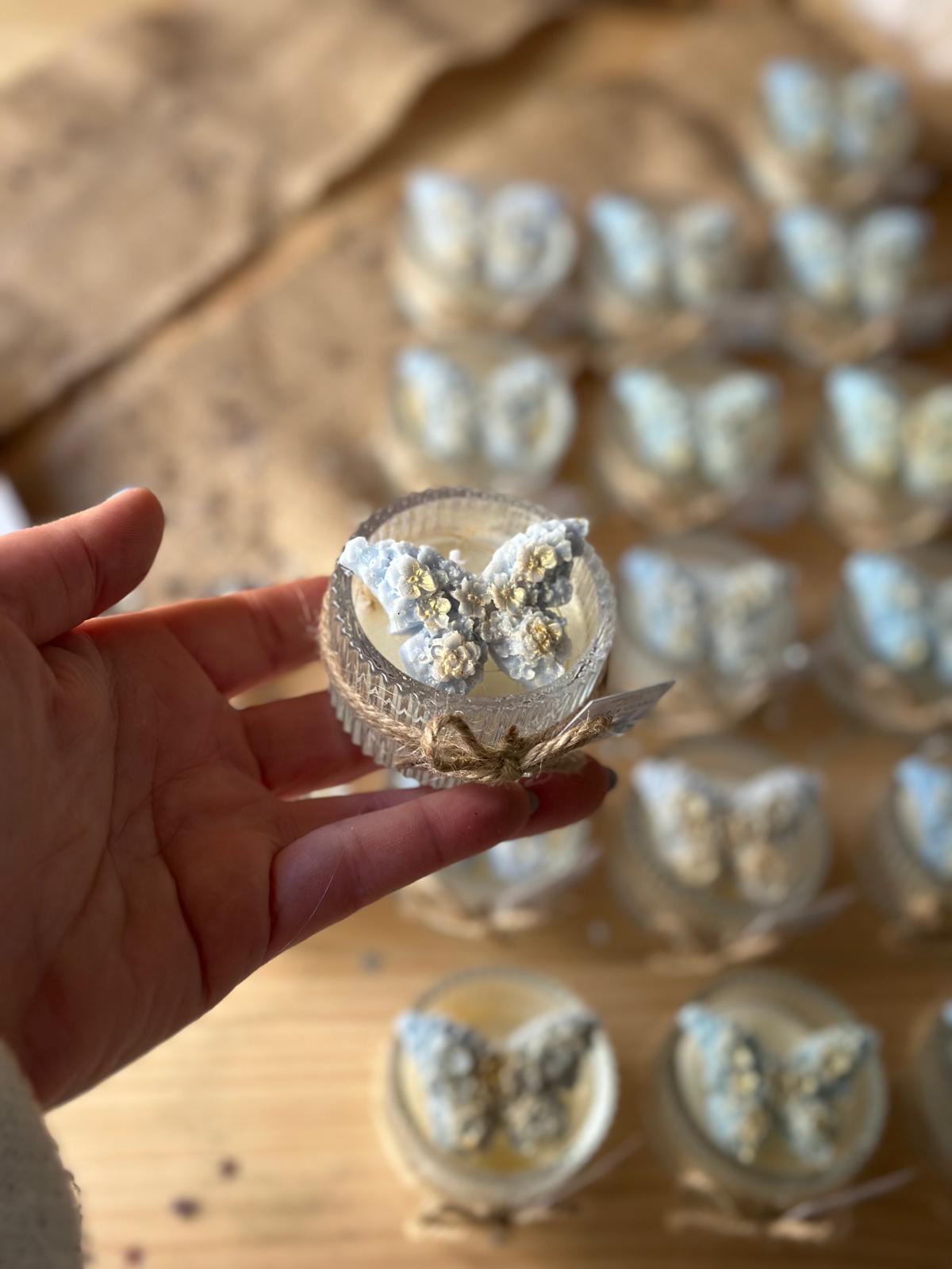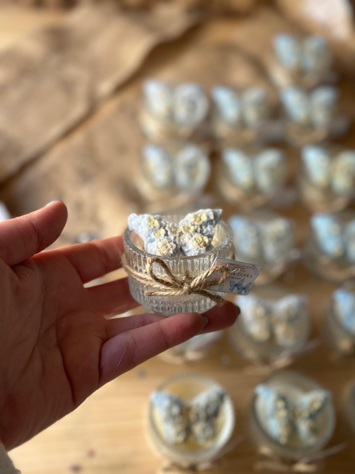 • Vela pequena em vidro transparente com decoração de borboleta azul e cordão de juta