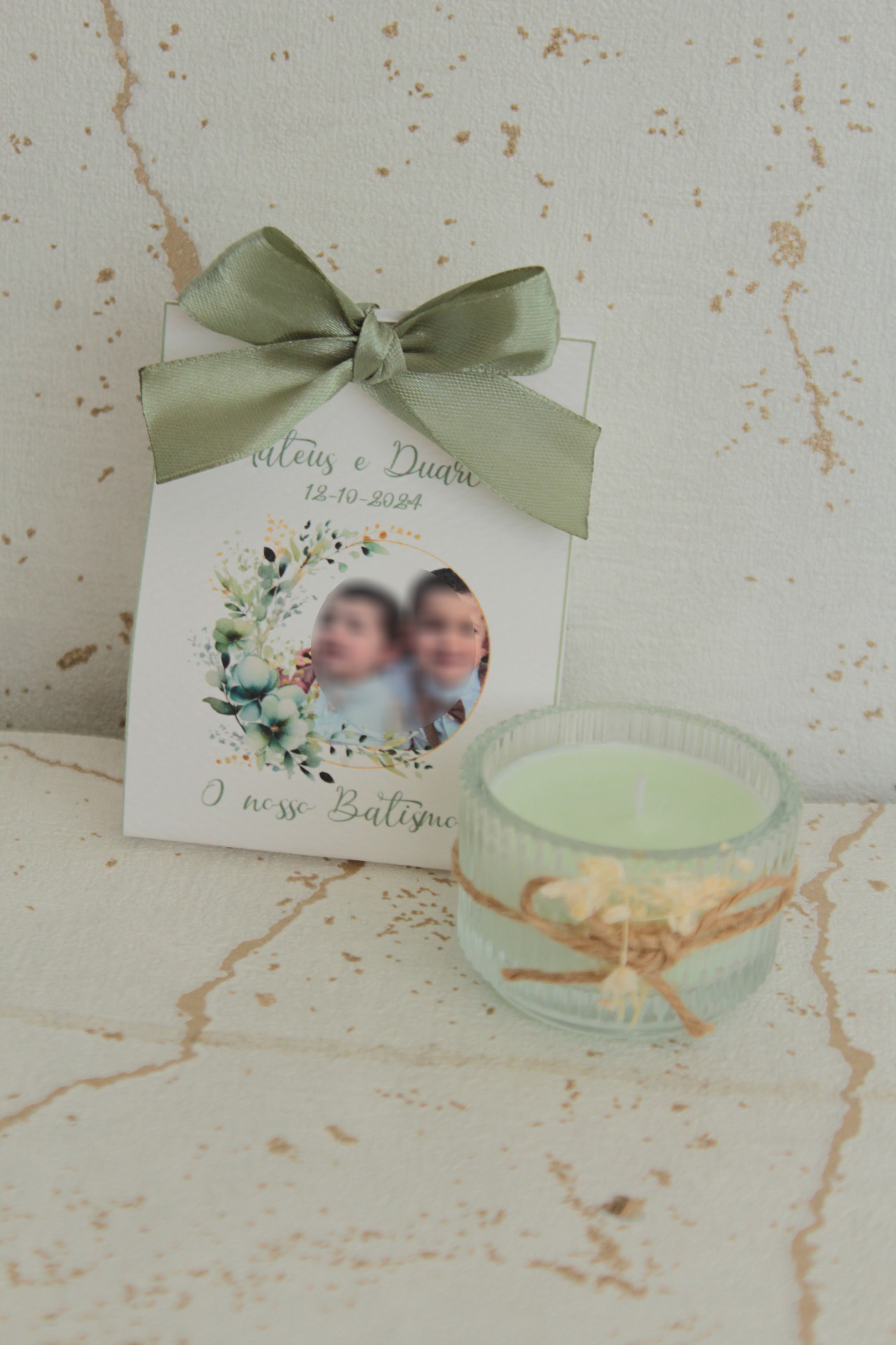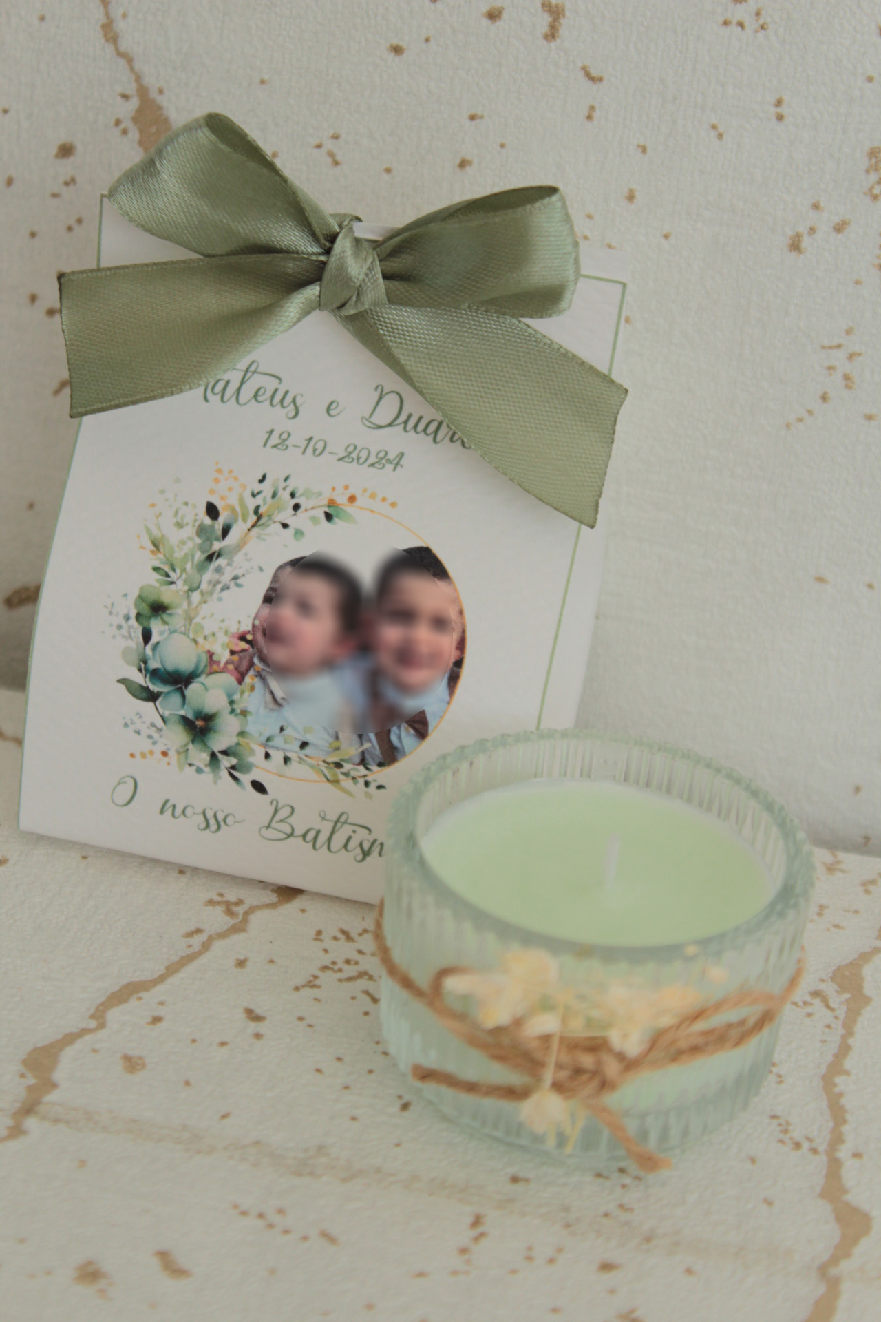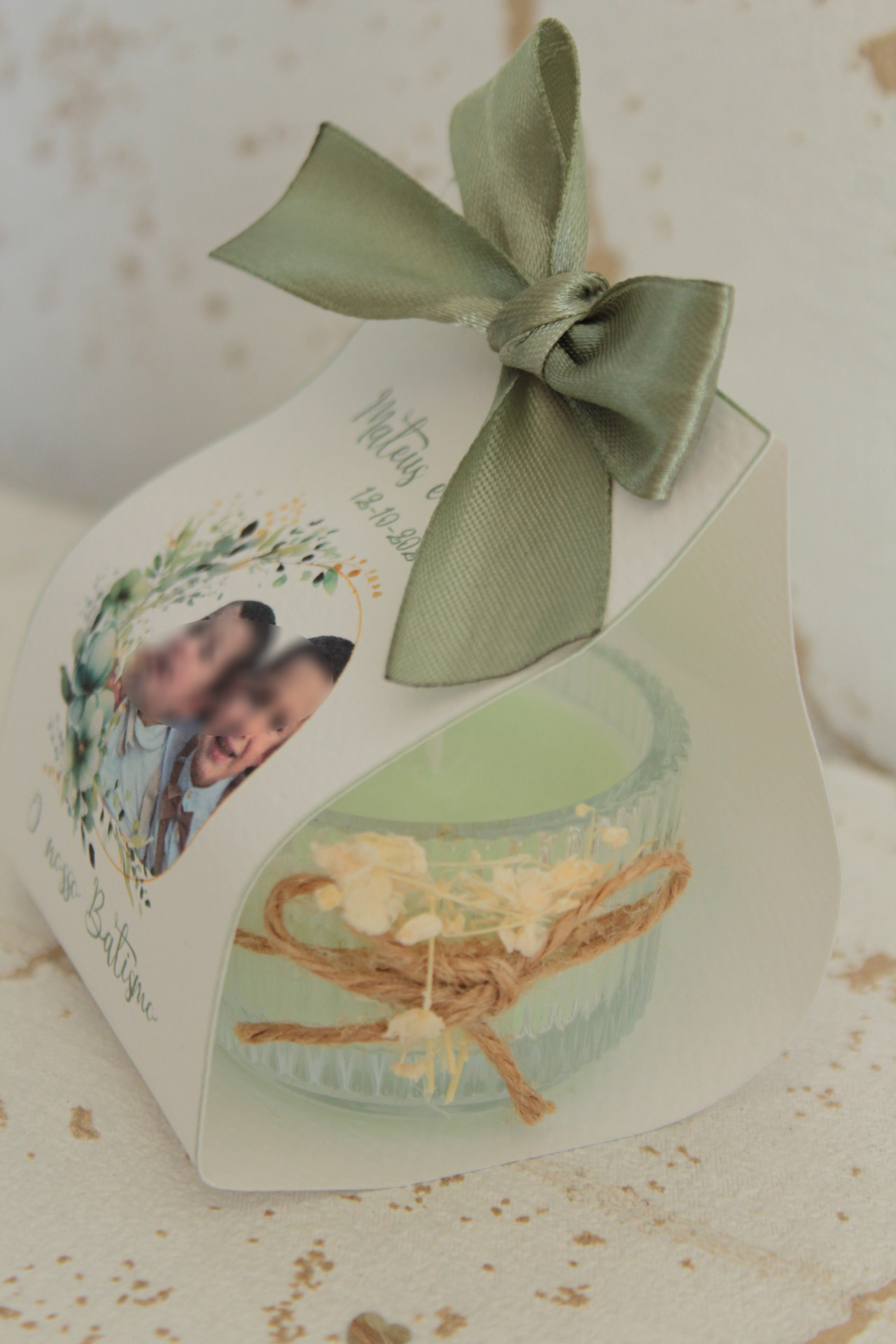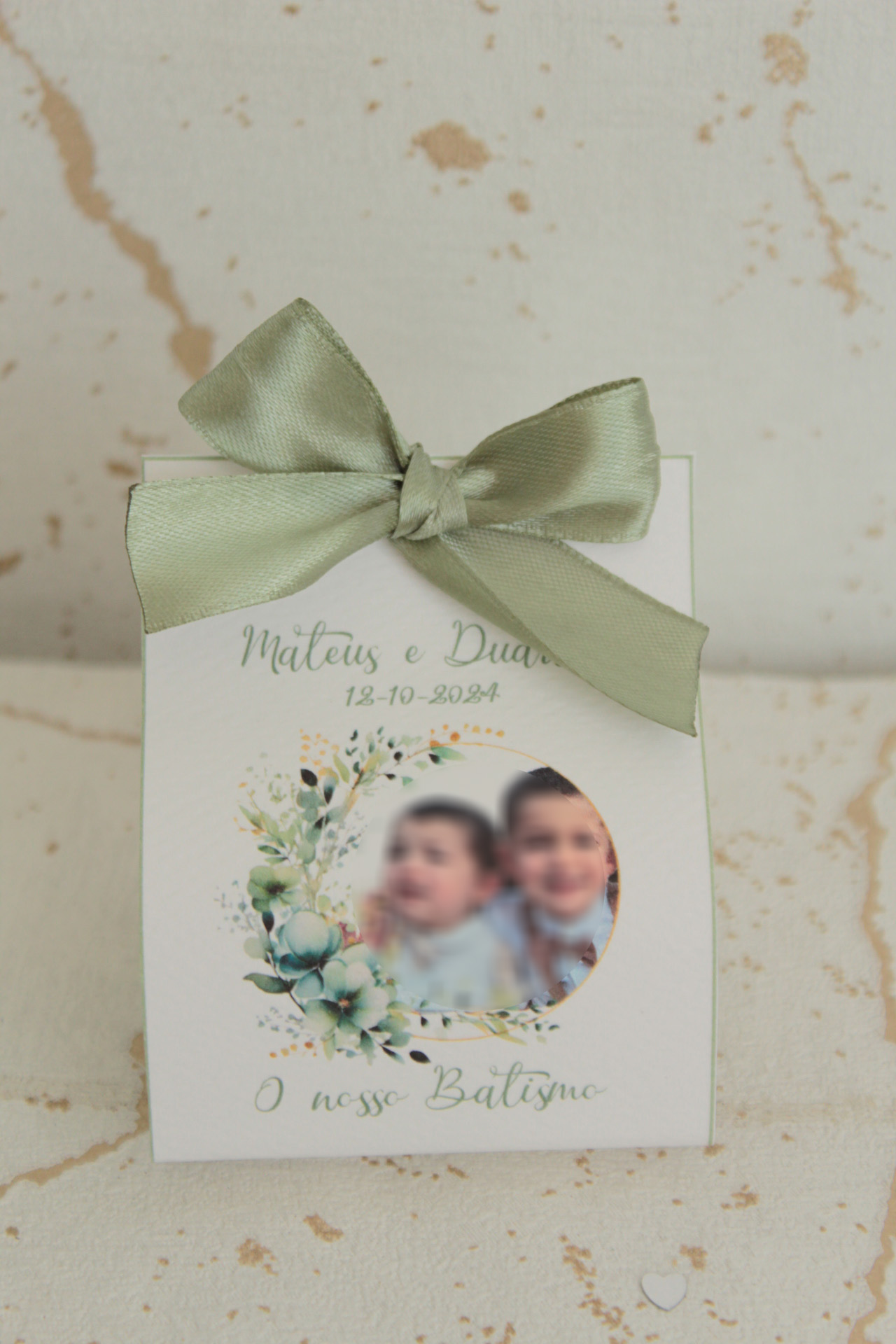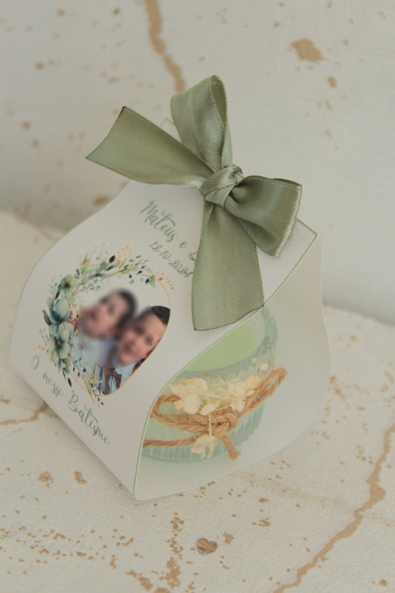 • Caixa branca com laço verde e foto de duas crianças alusiva a batismo.