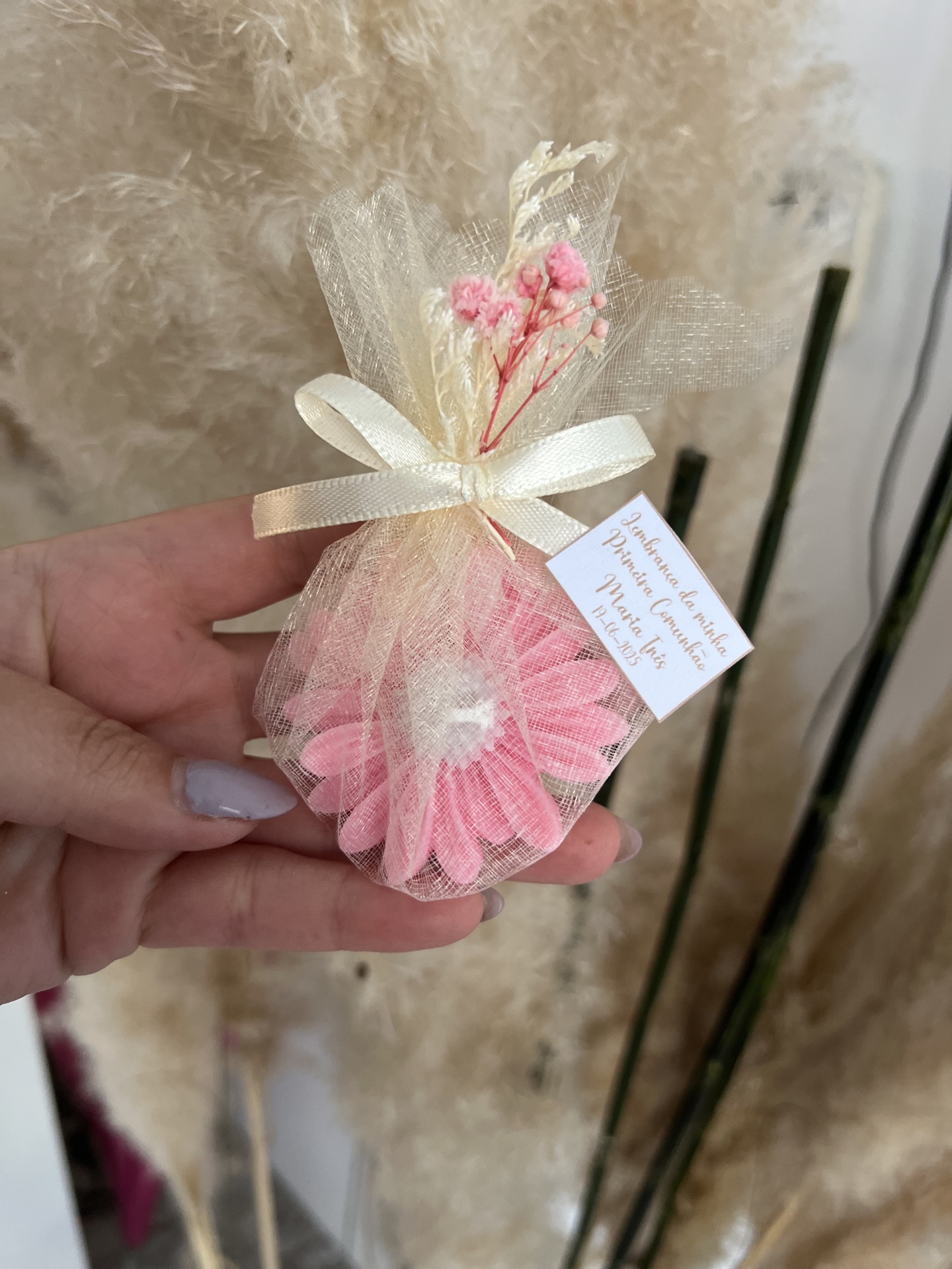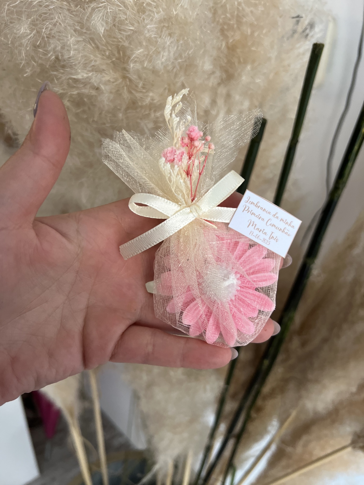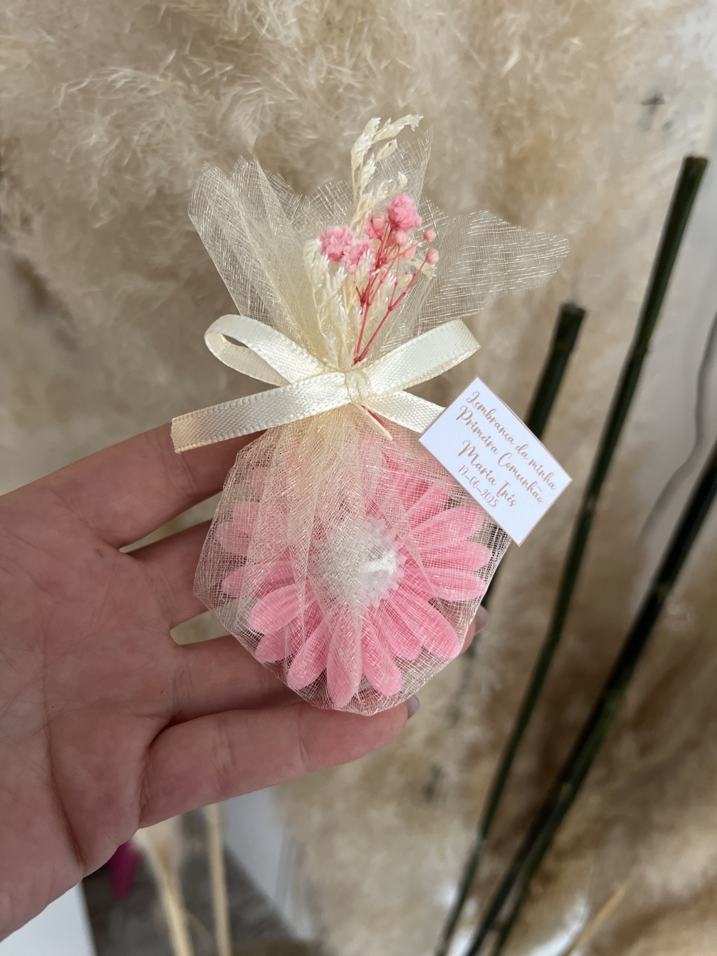 • Mala de tule creme com flor rosa e etiqueta de Primeira Comunhão
