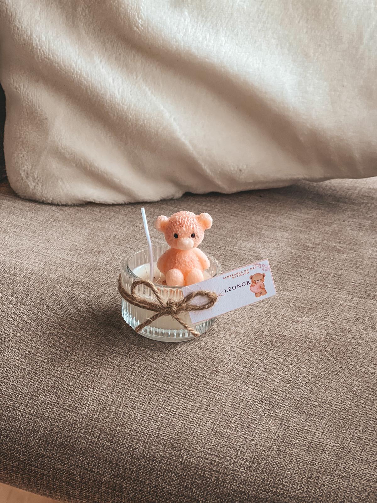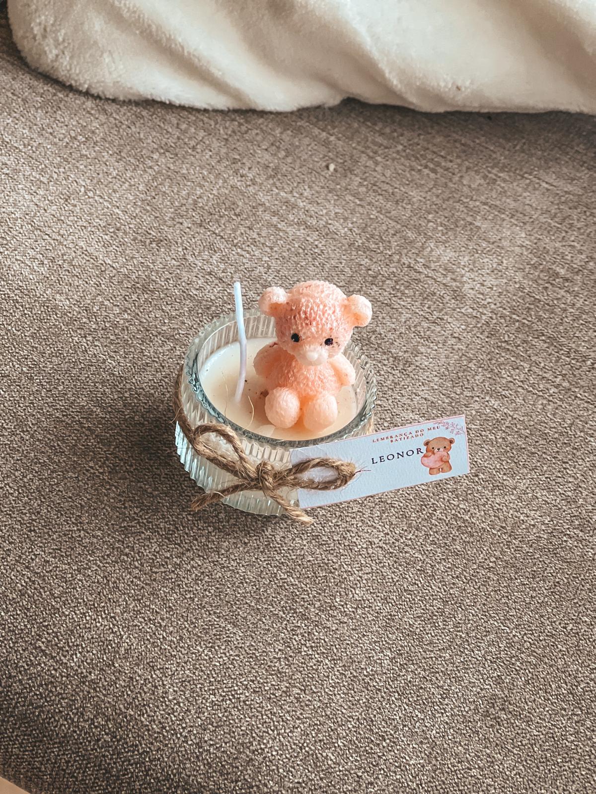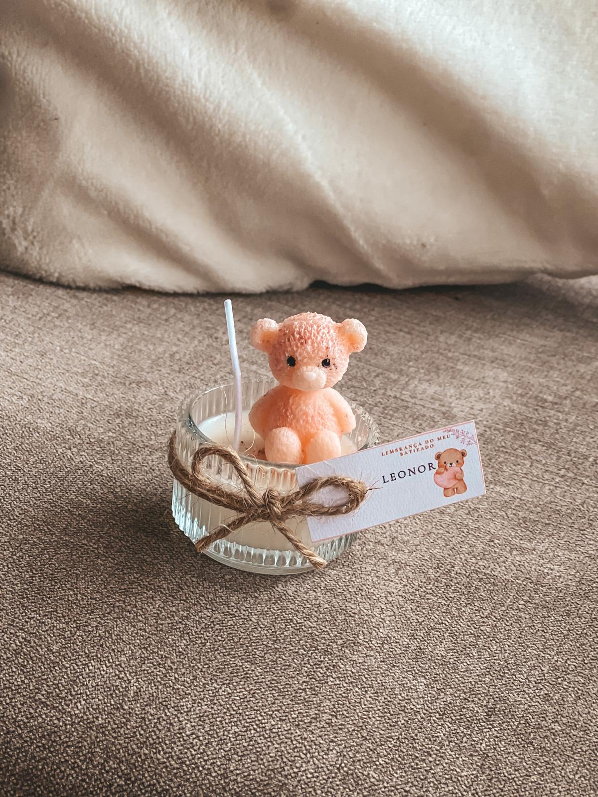 • Vela perfumada em vidro com urso de peluche e etiqueta LEONORA