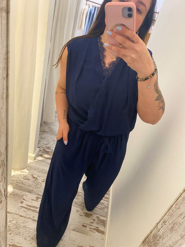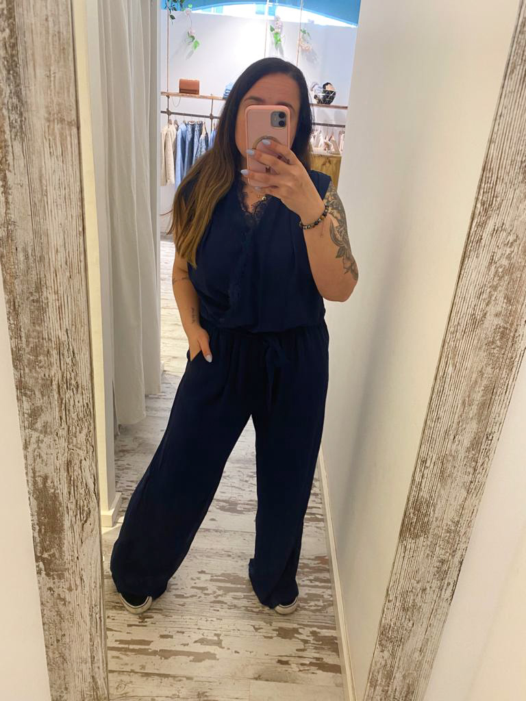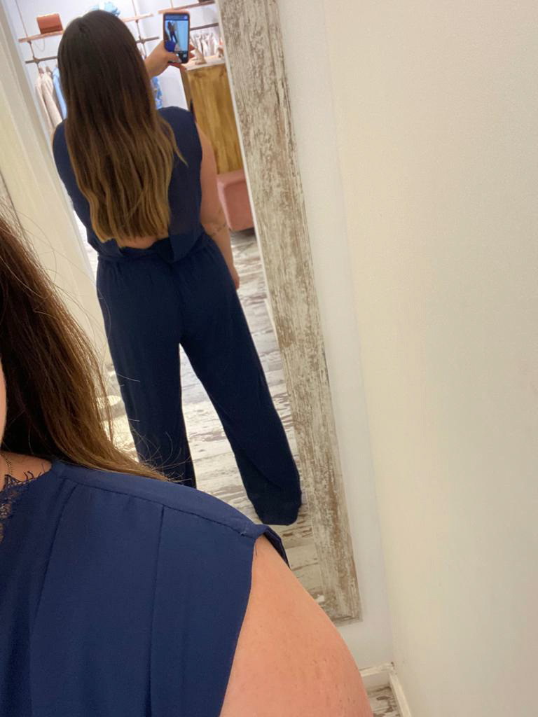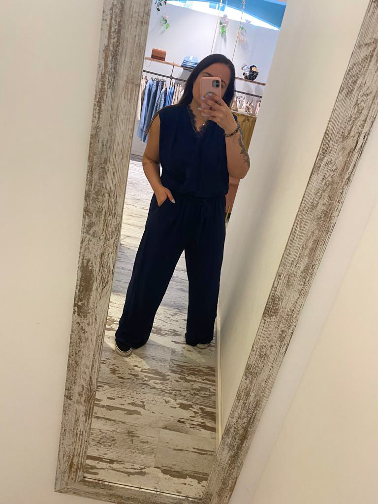 • Macacão azul escuro de tecido leve com calças largas, usado por mulher em espelho