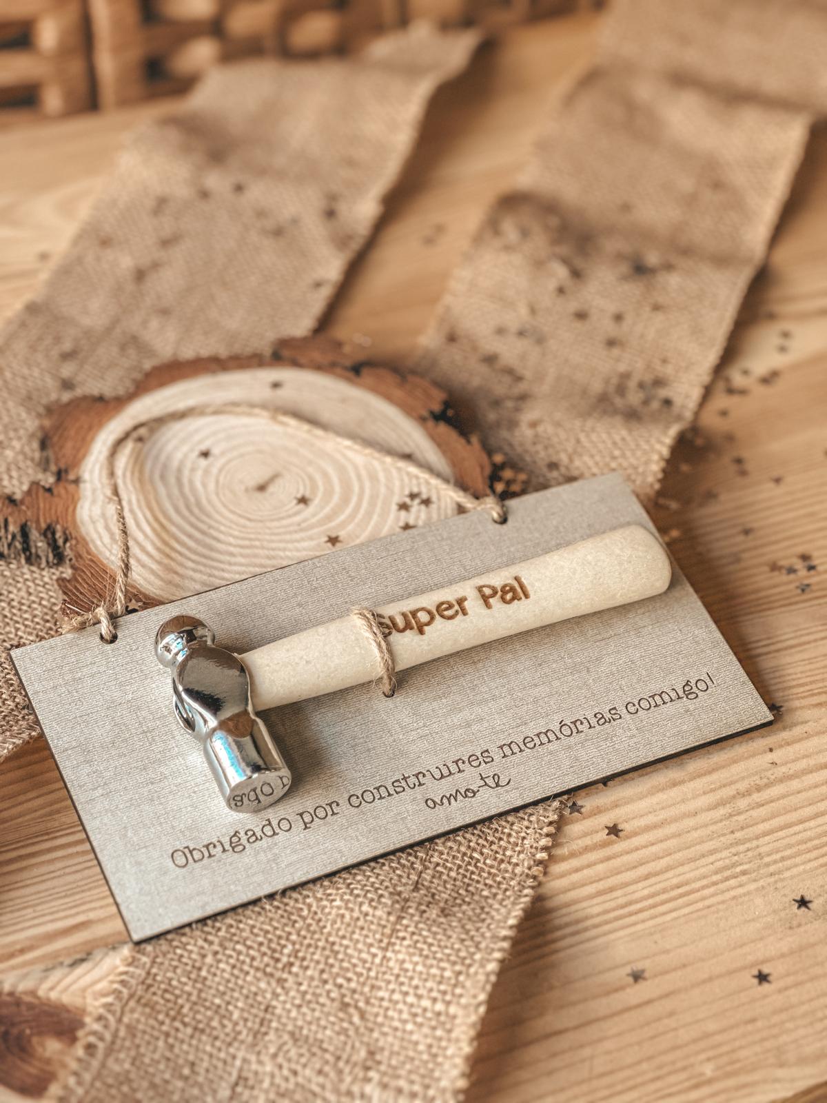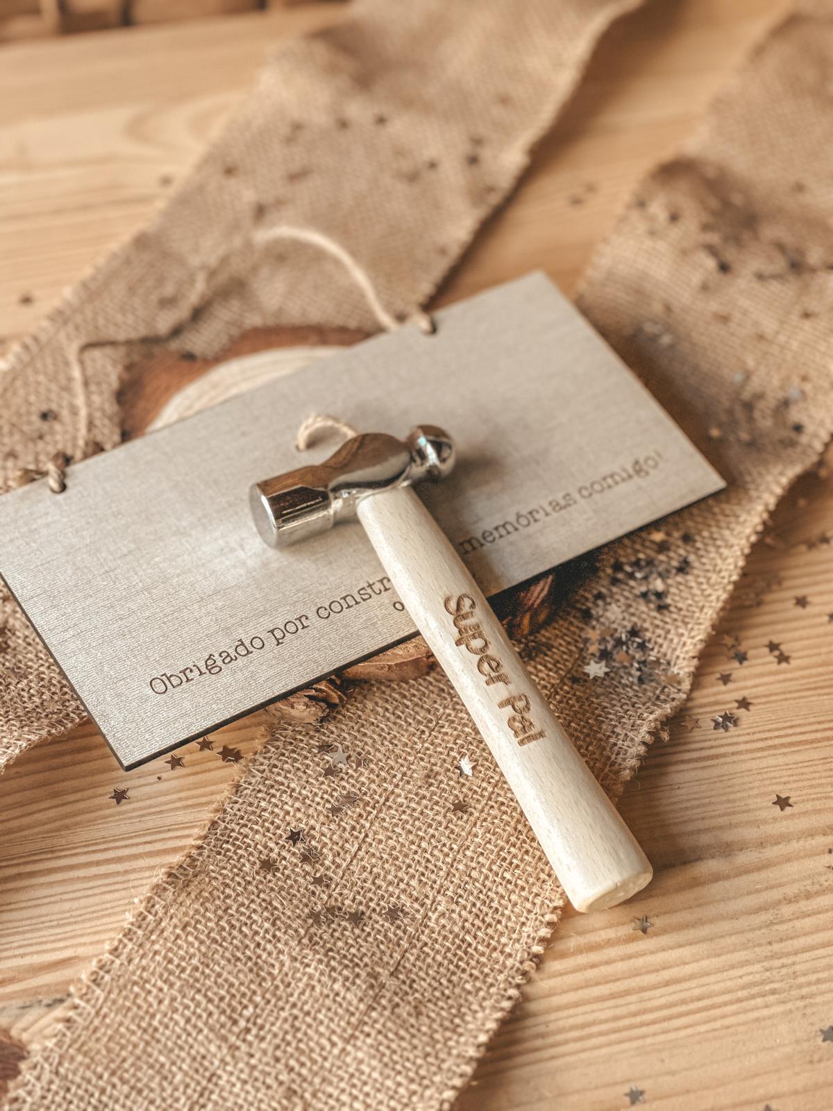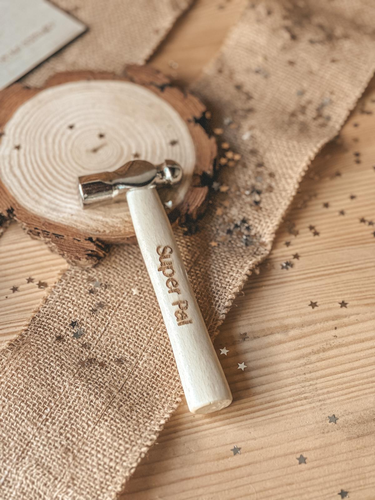• Martelo pequeno em madeira clara com cabeça prateada e texto gravado no cabo sobre cartão cinza e tecido bege