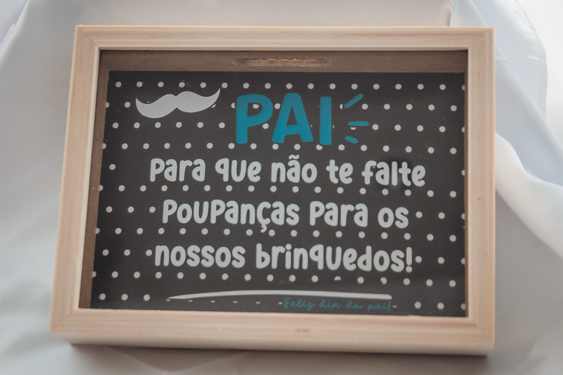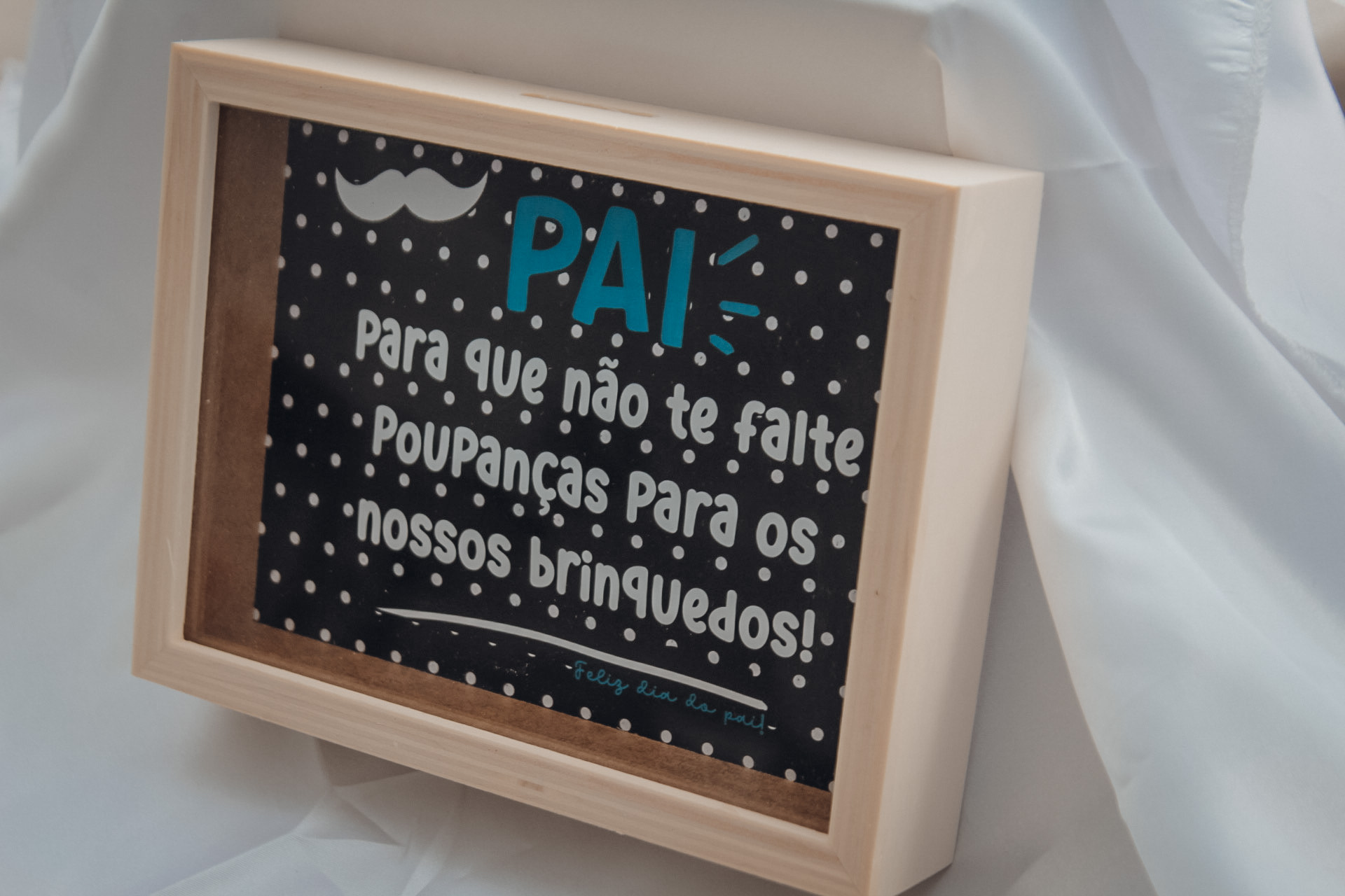 • Caixa cofre de madeira com texto para pai e fundo preto com pontos brancos
