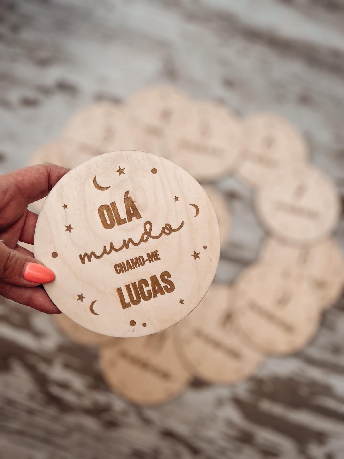 • Disco redondo de madeira com texto gravado OLÁ mundo CHAMO-ME LUCAS
