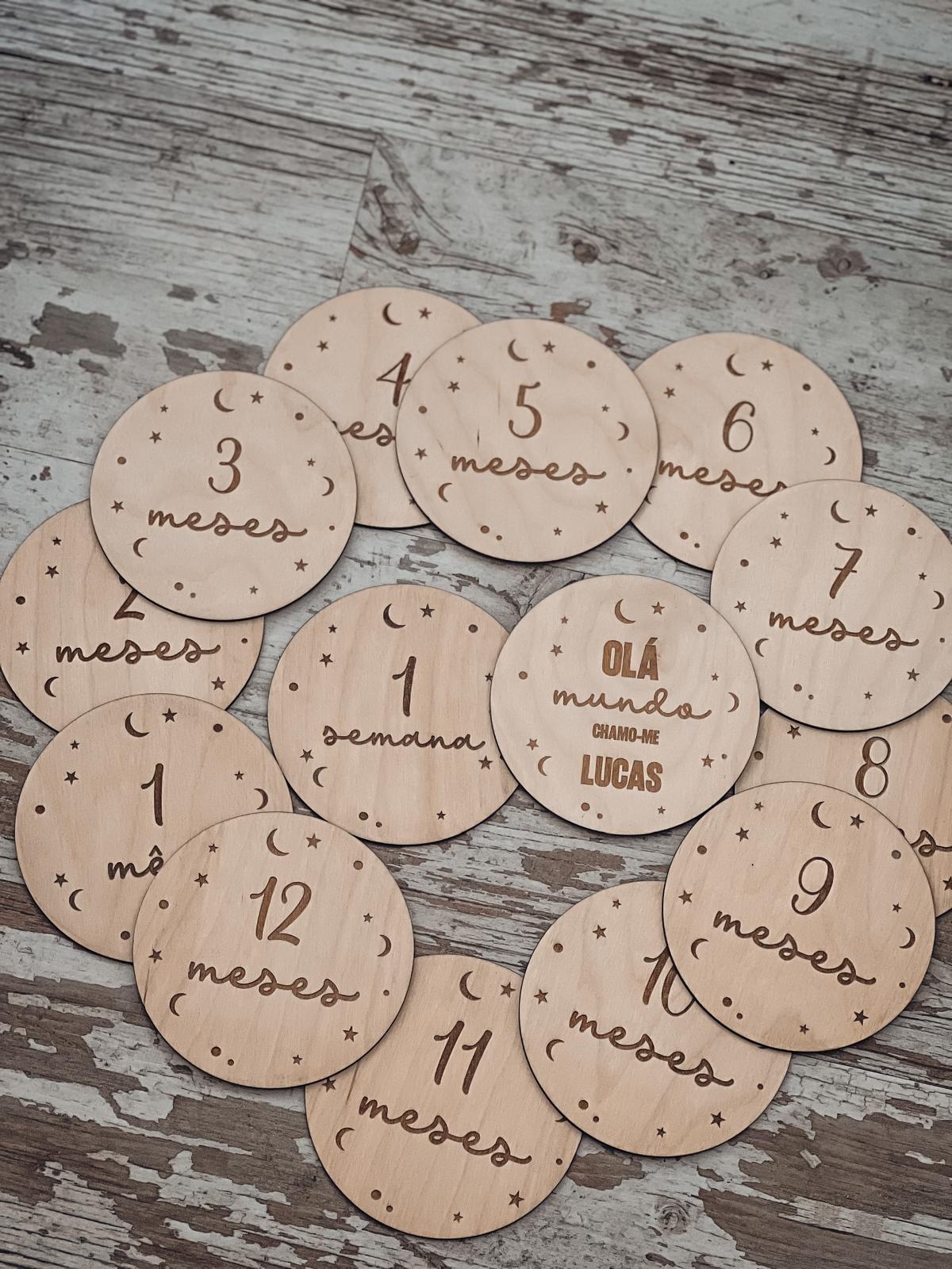• Placas redondas de madeira com gravações em português sobre meses e uma semana, decoradas com estrelas e luas.