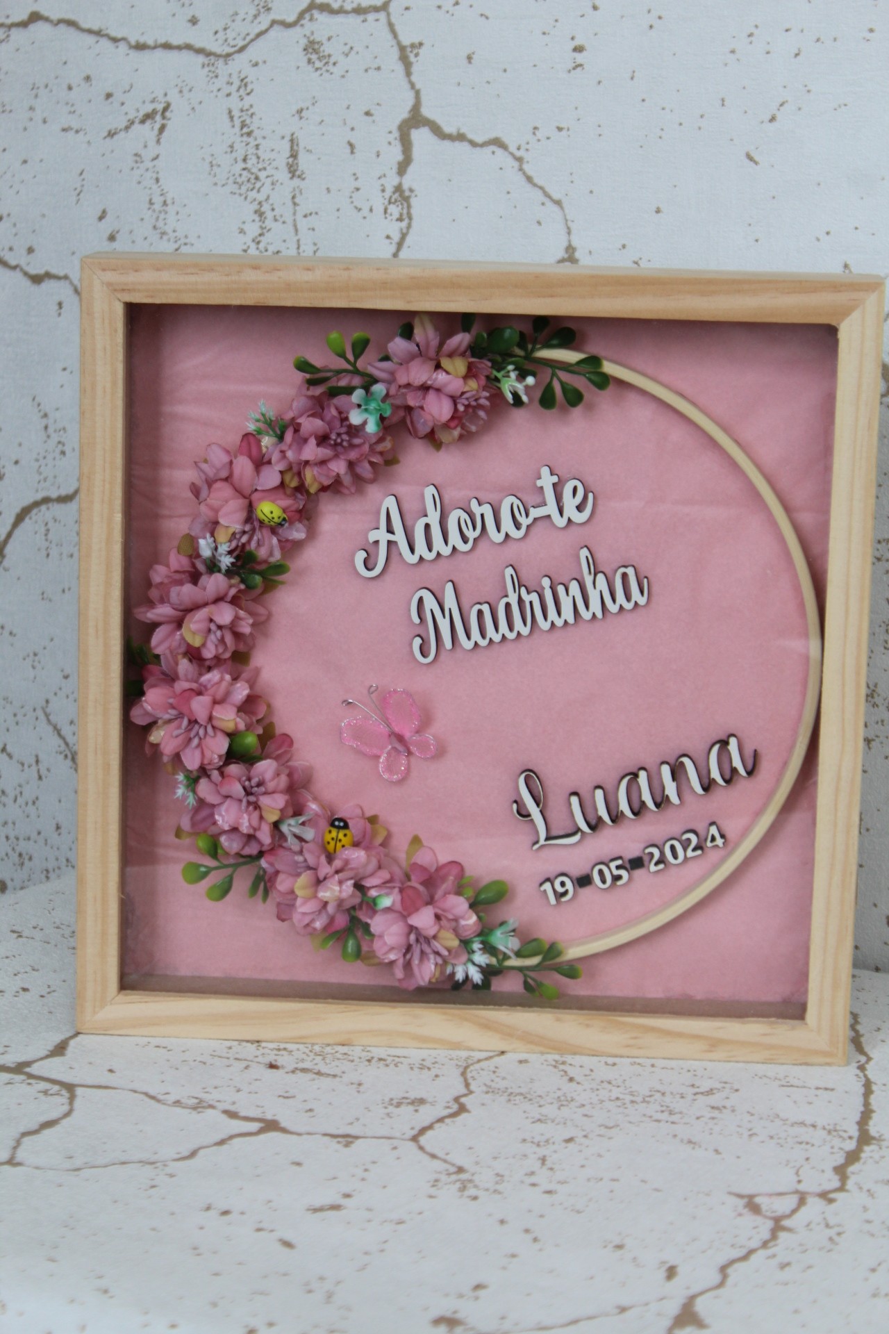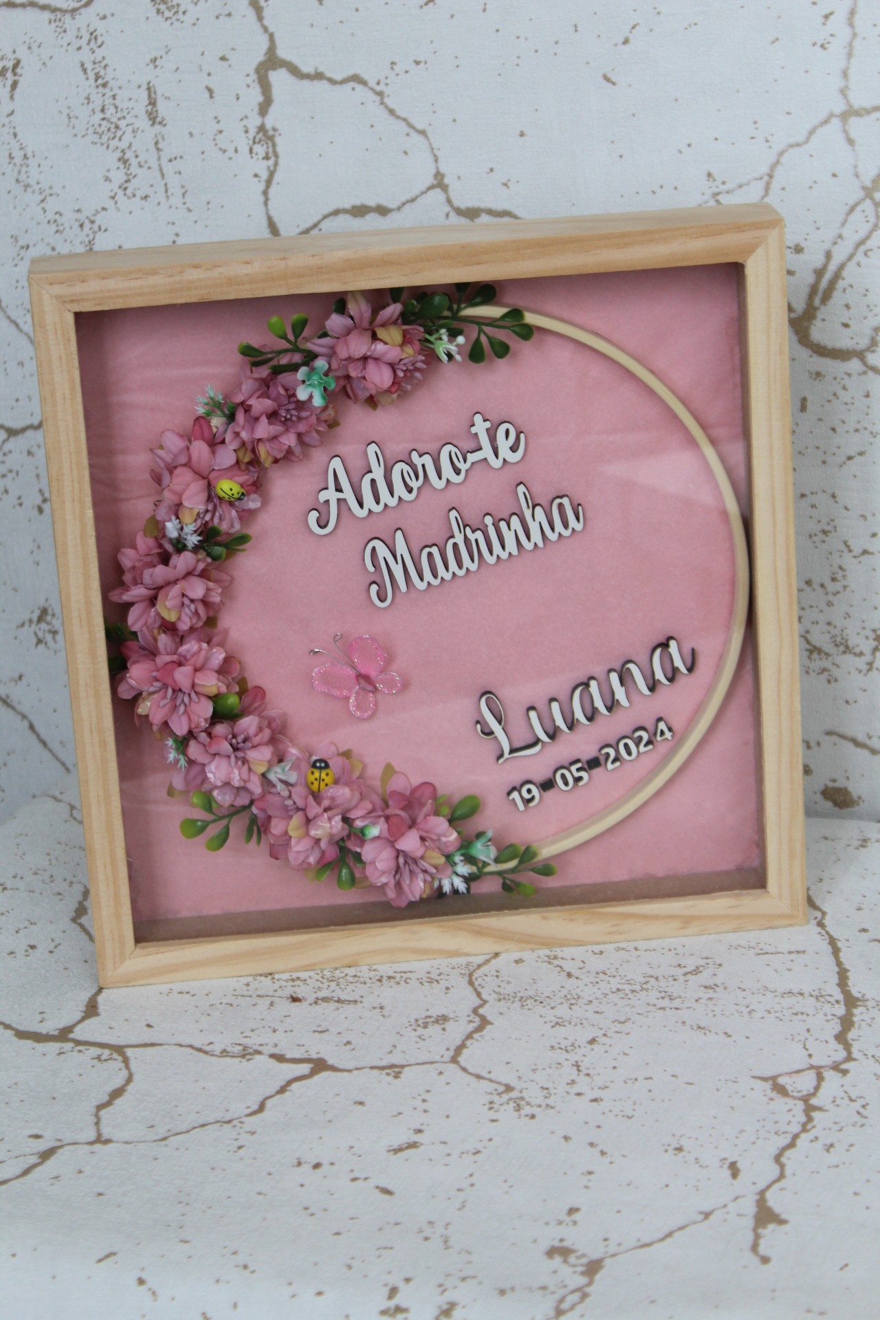 • Quadro decorativo com flores e texto para madrinha em moldura de madeira