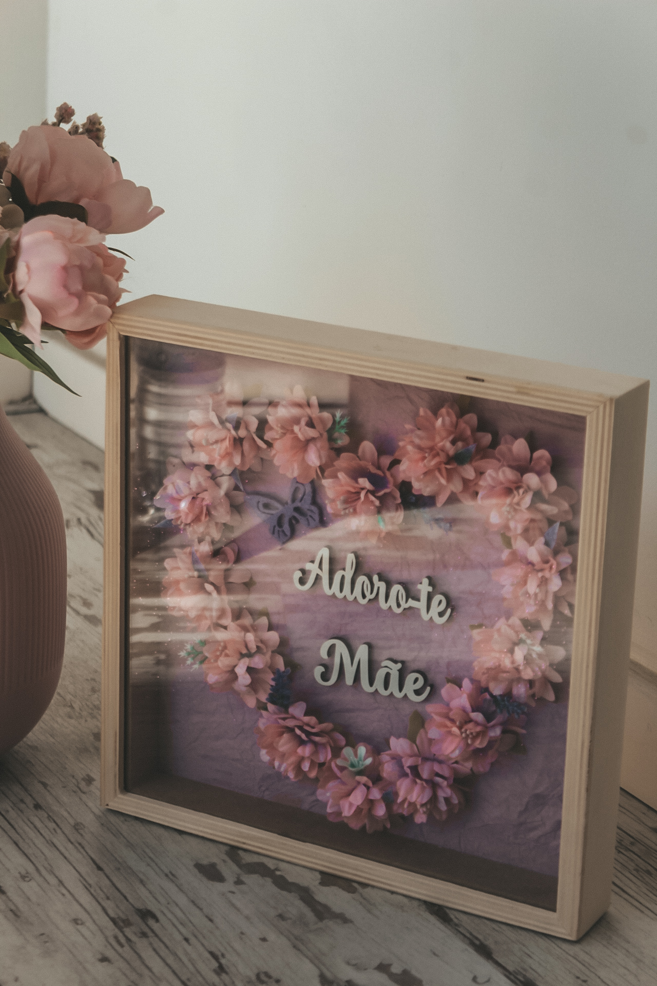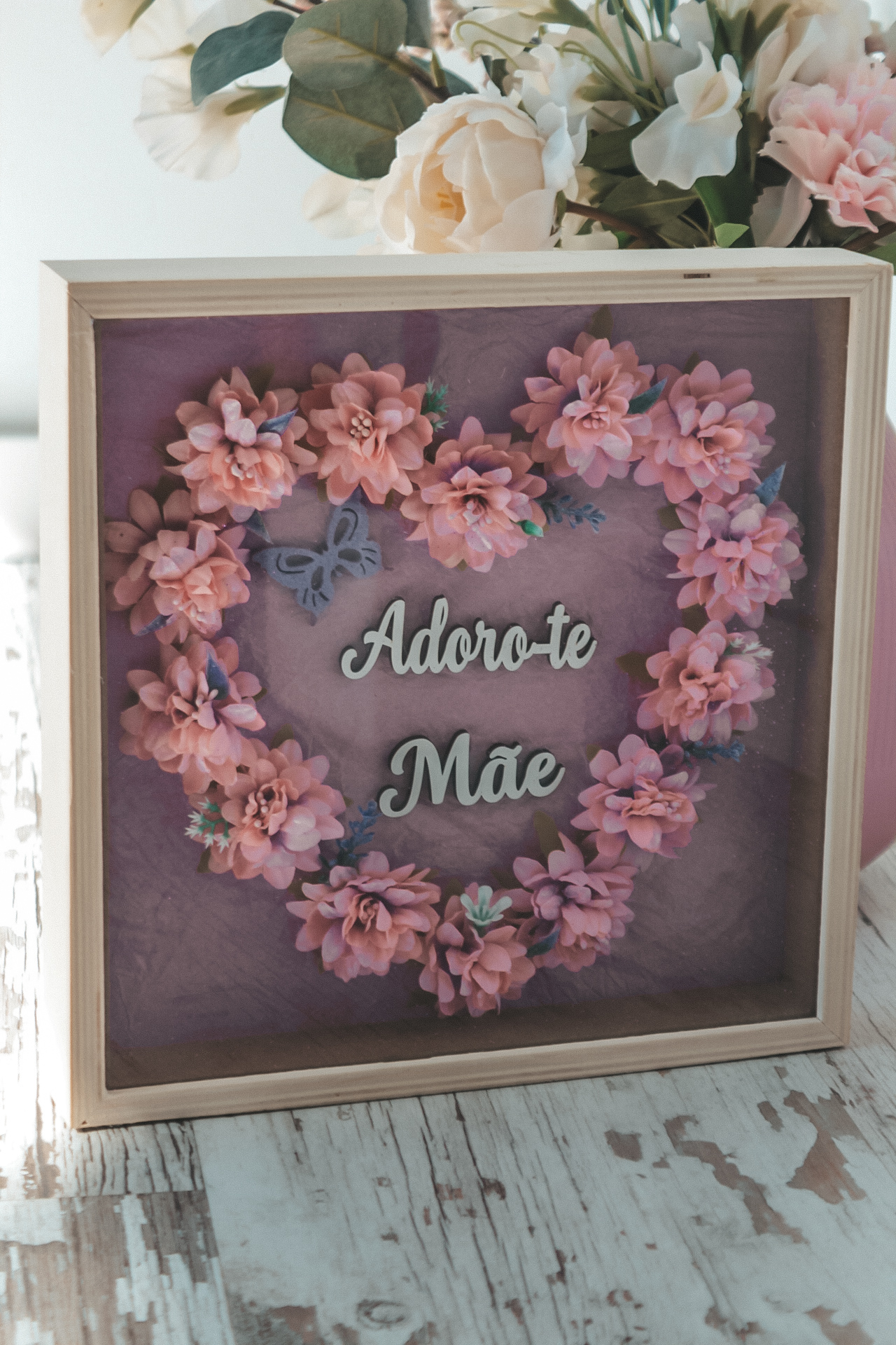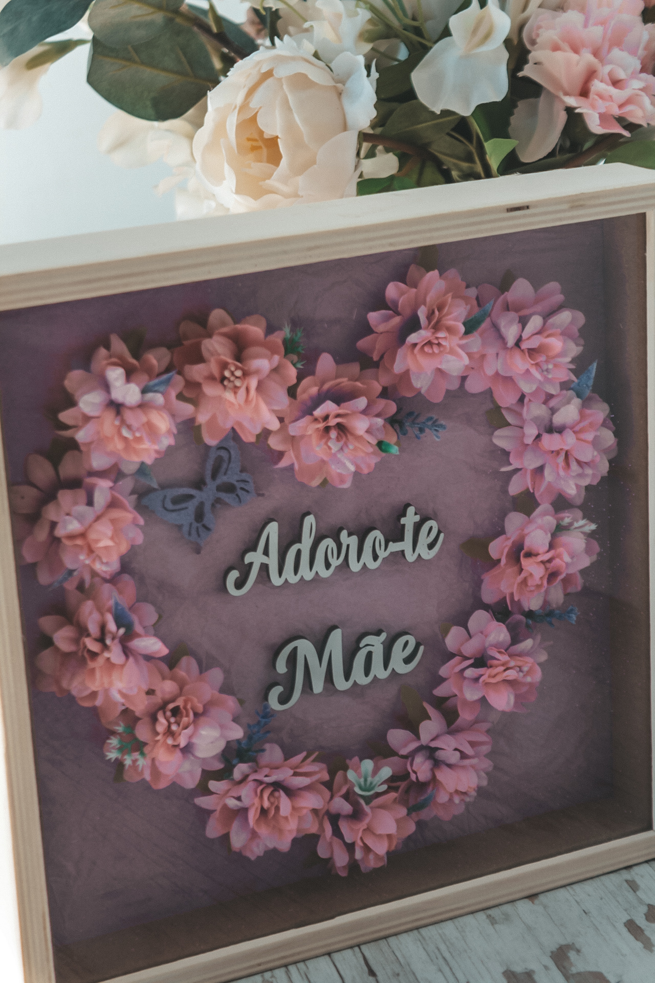 • Quadro decorativo com flores artificiais em forma de coração e texto 'Adoro-te Mãe'