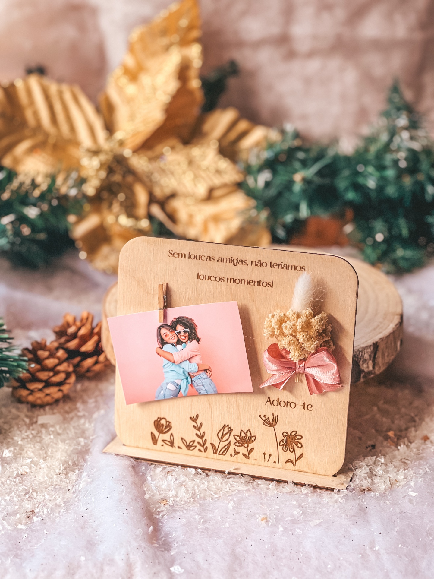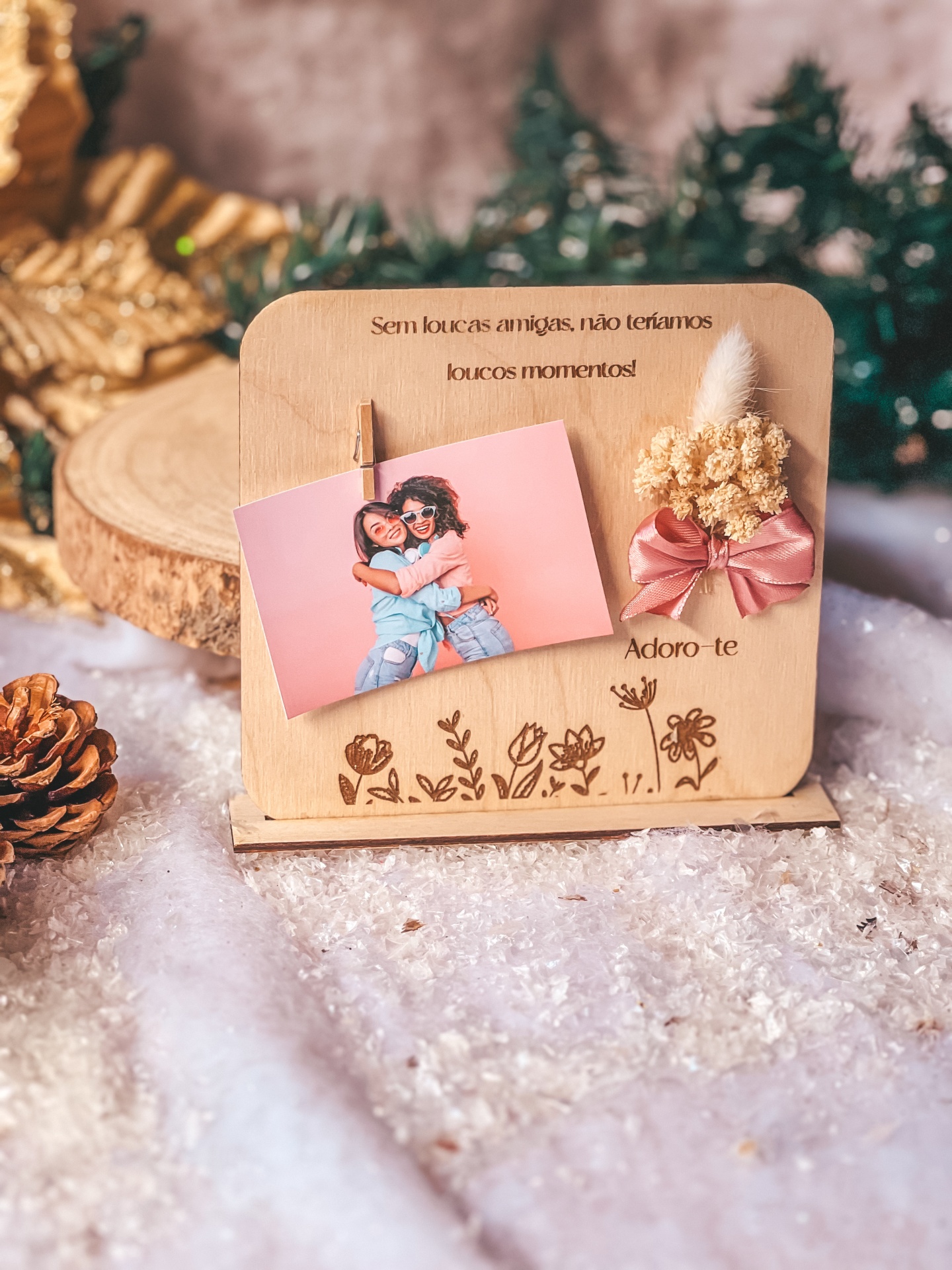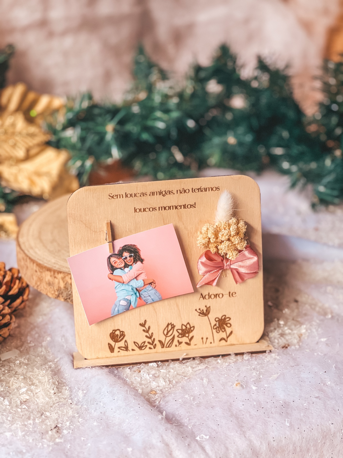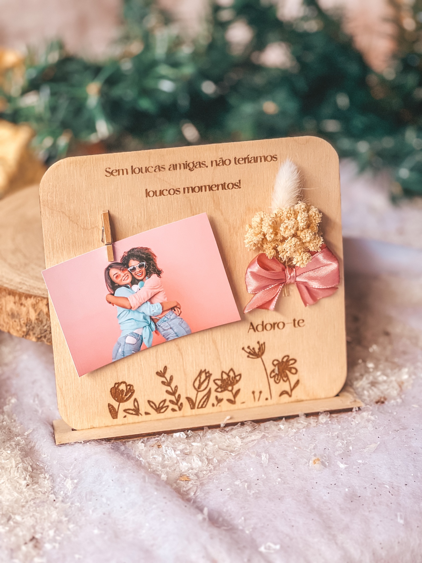 • Suporte de madeira decorativo com fotografia, flores secas e mensagem de amizade em português