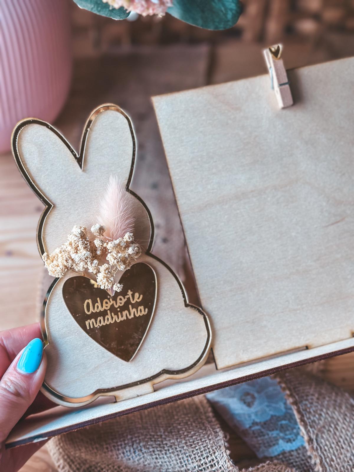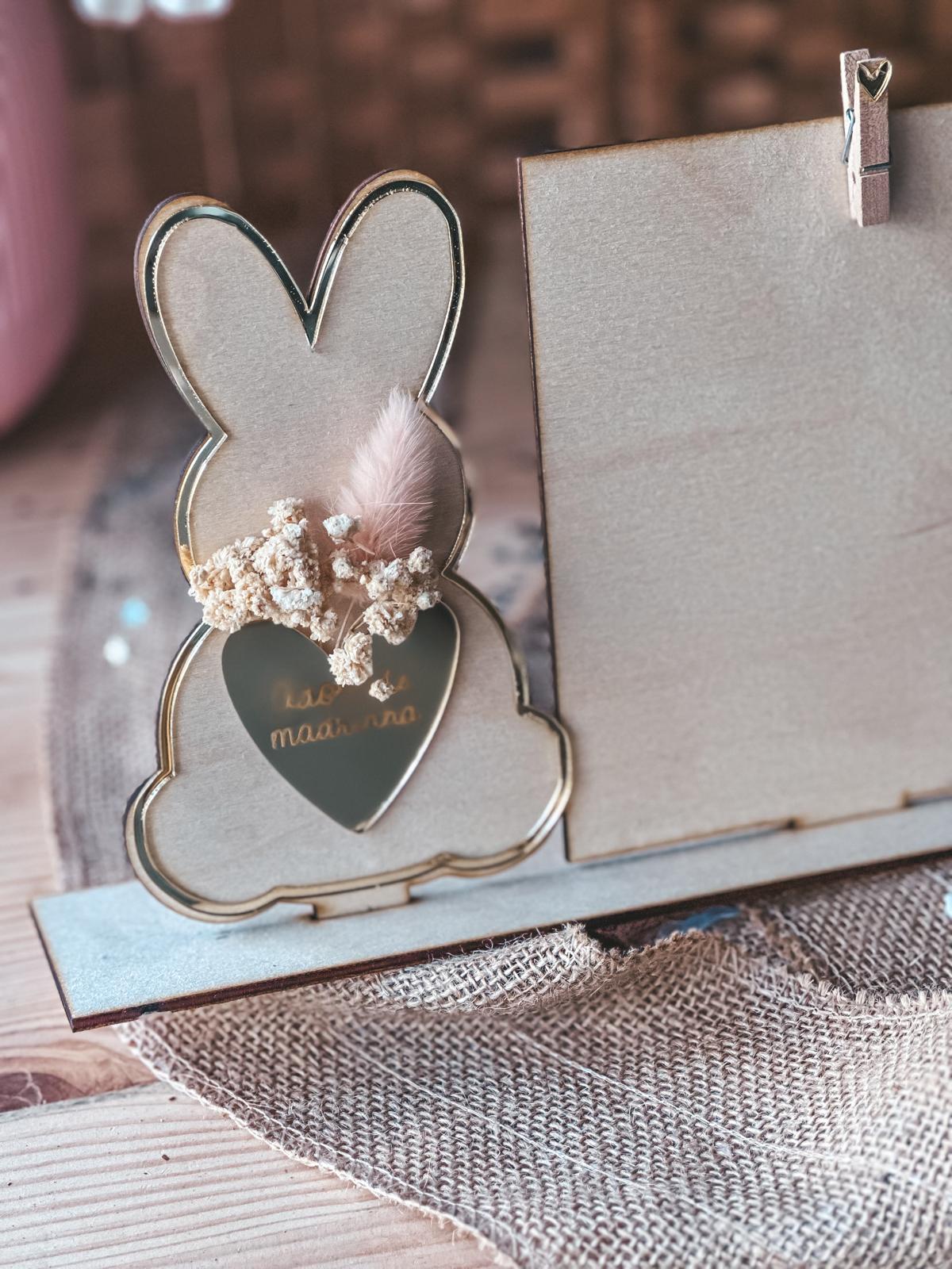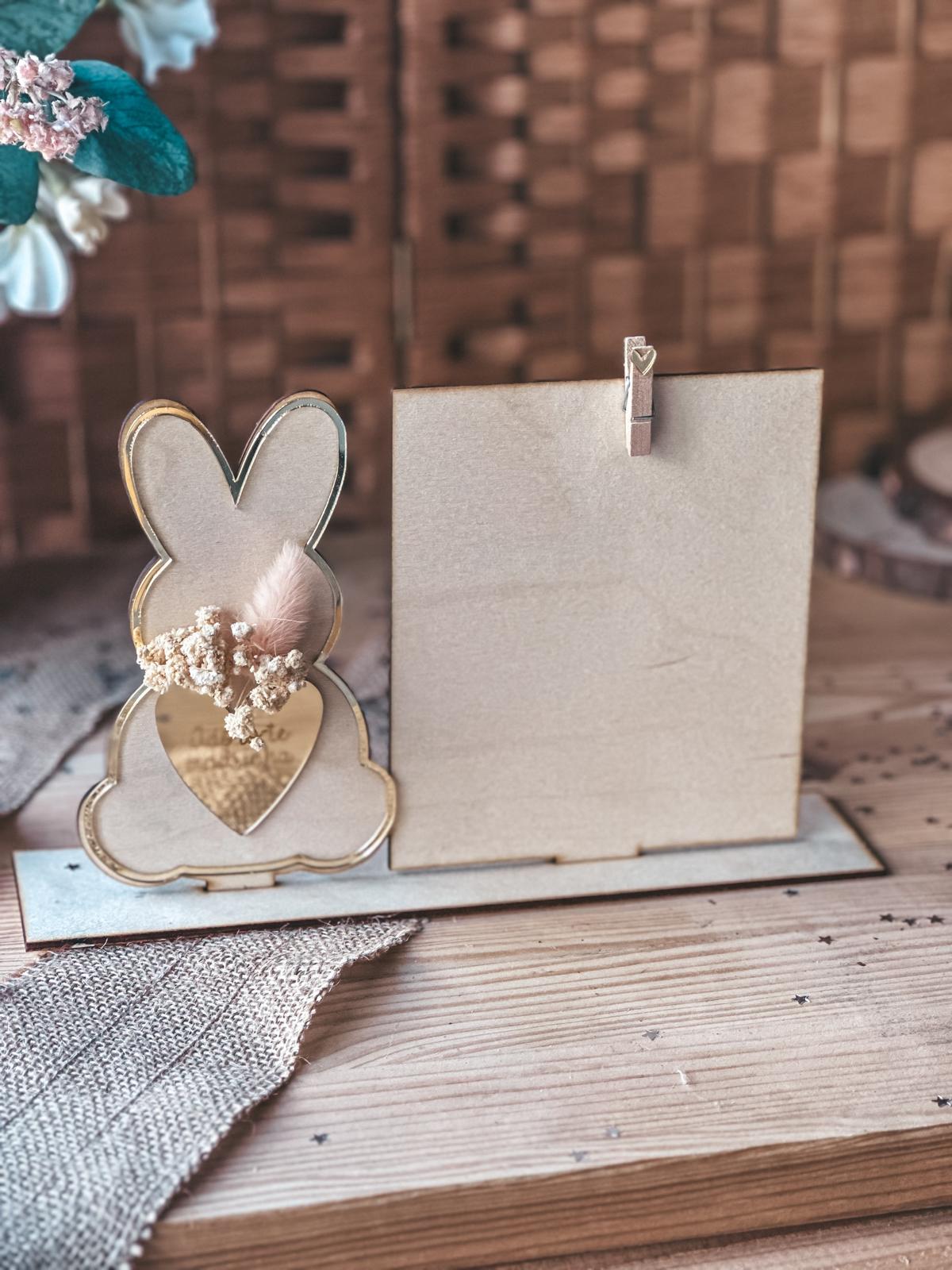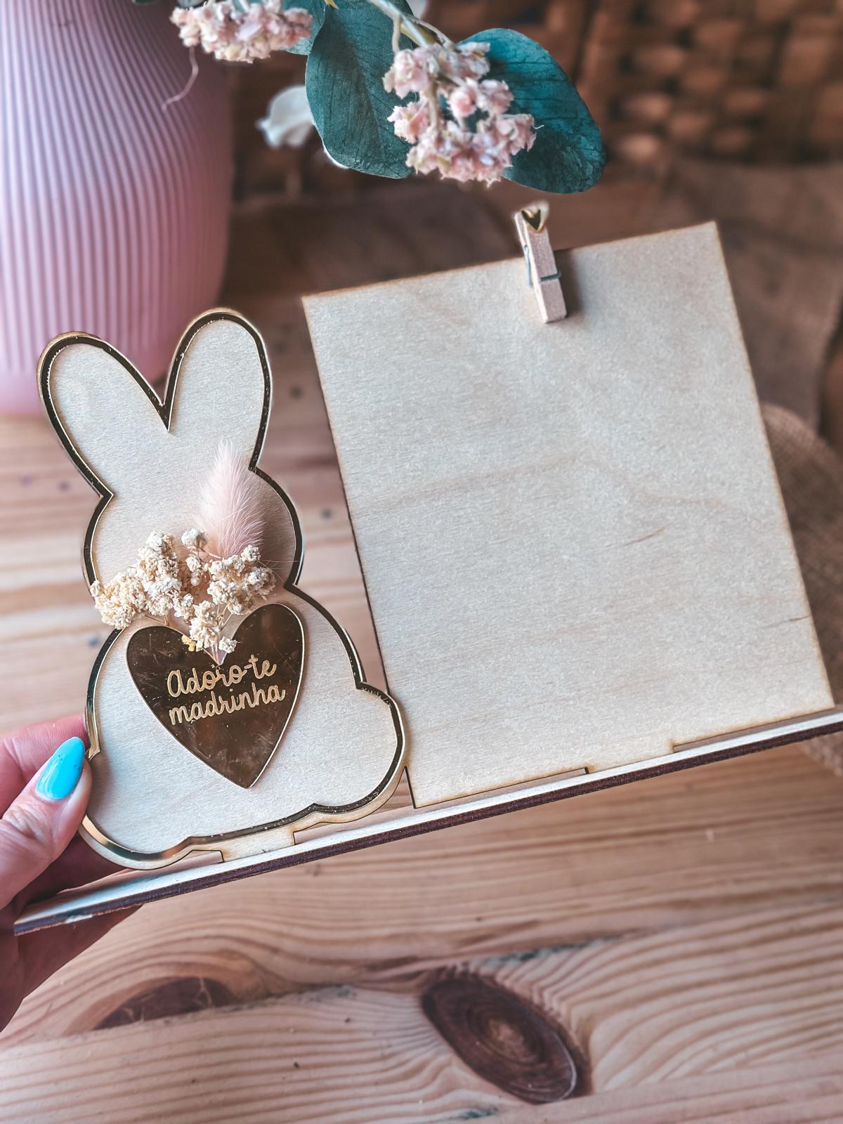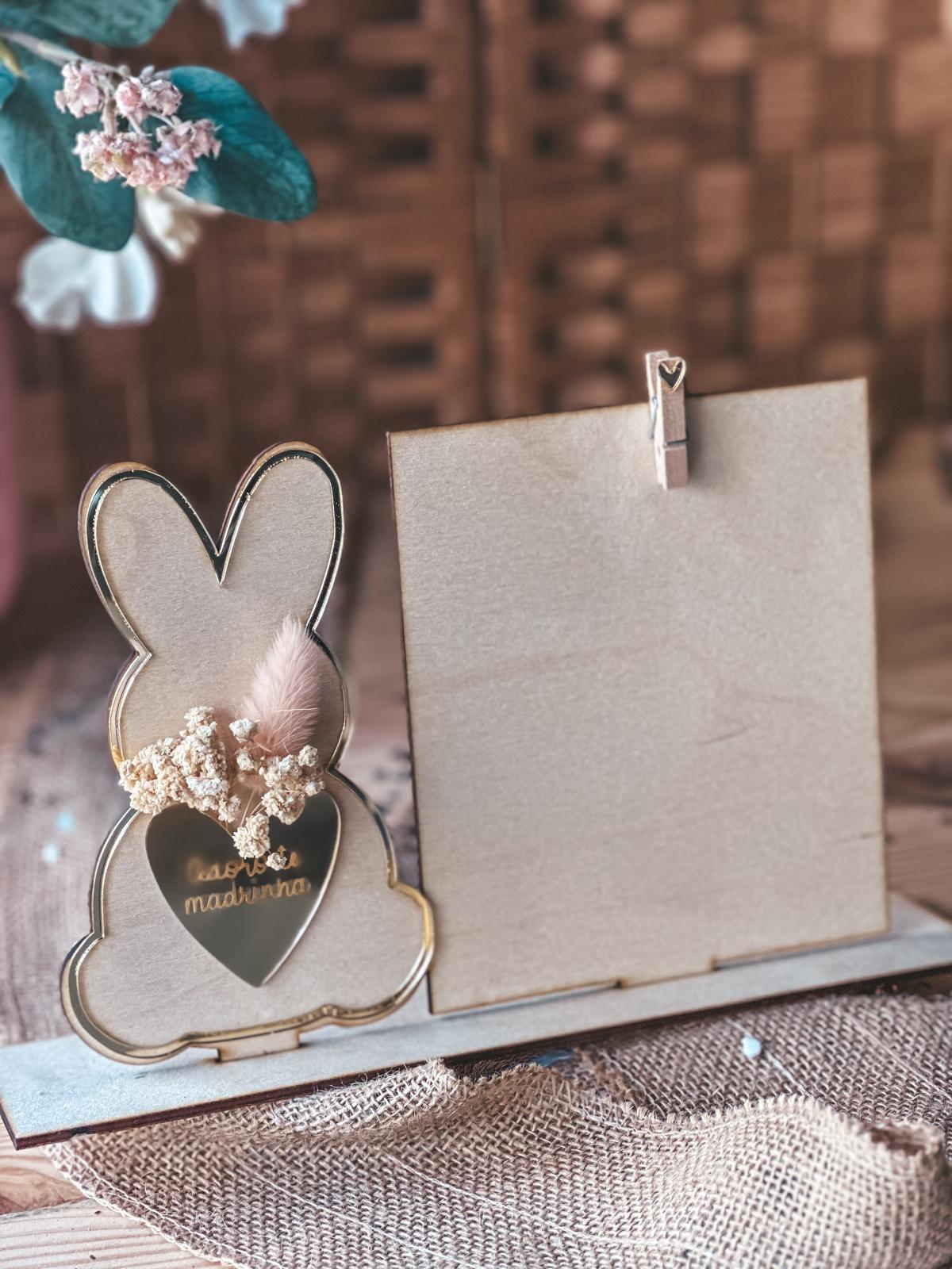 • Suporte decorativo em madeira em forma de coelho com flores secas e moldura para foto.