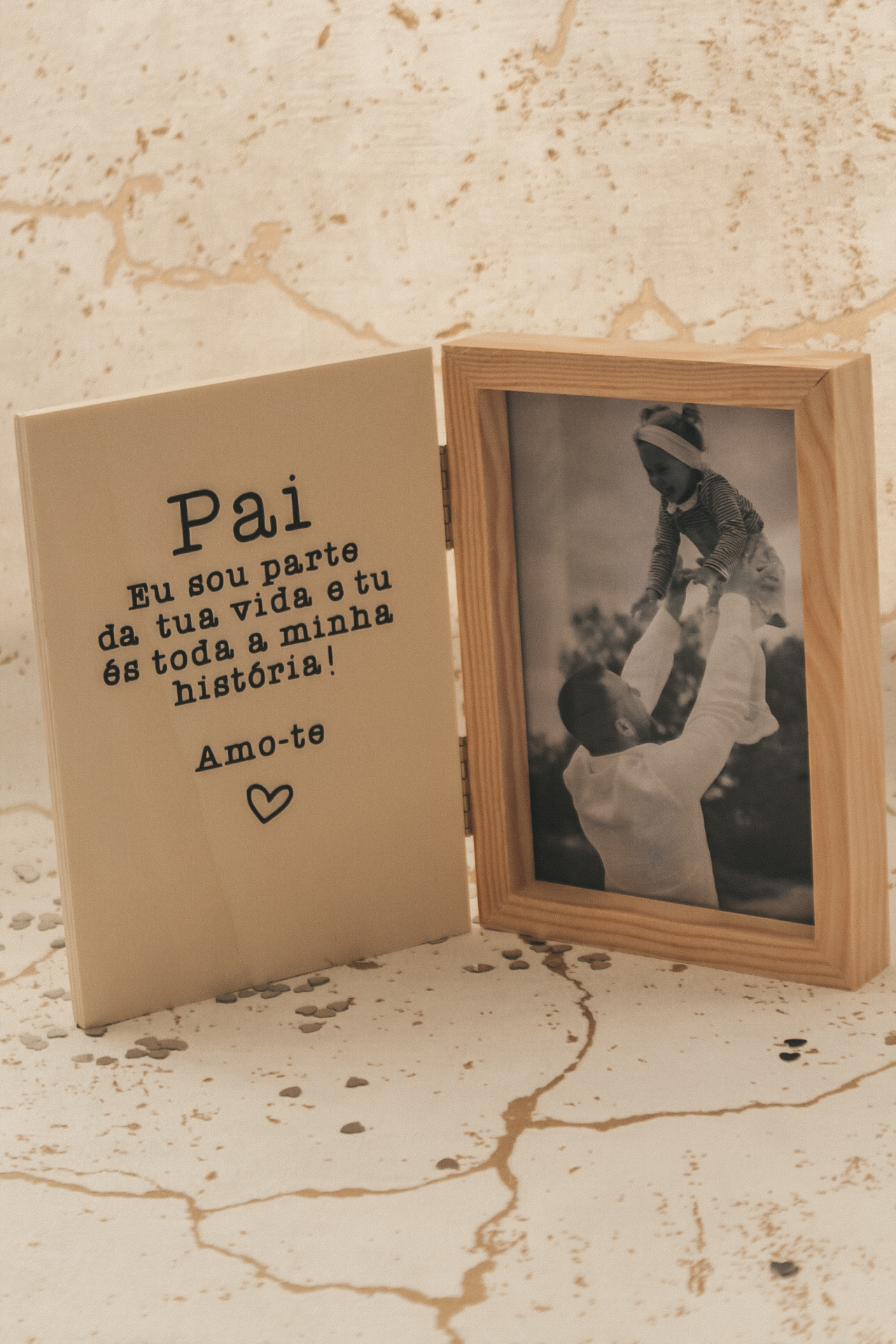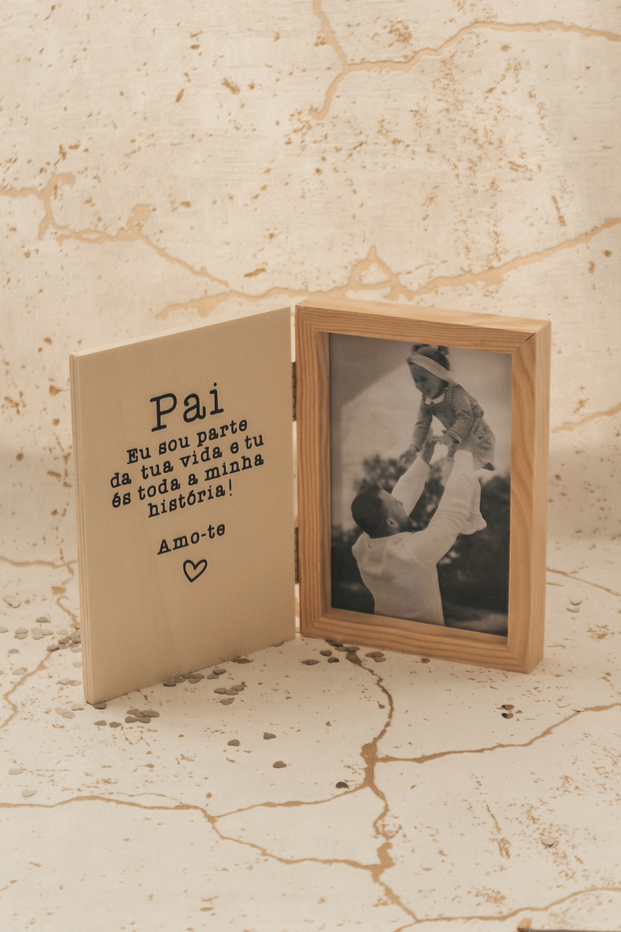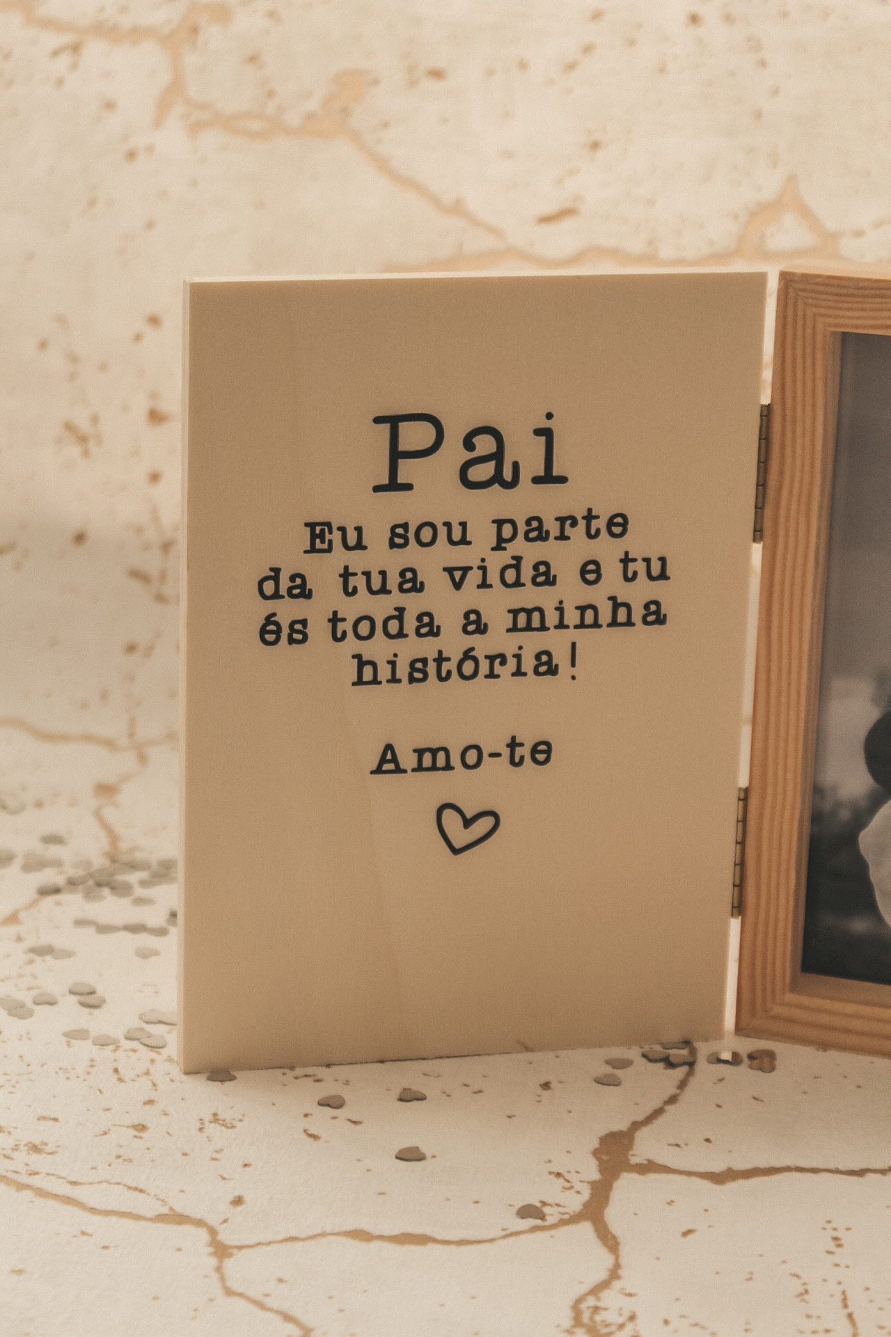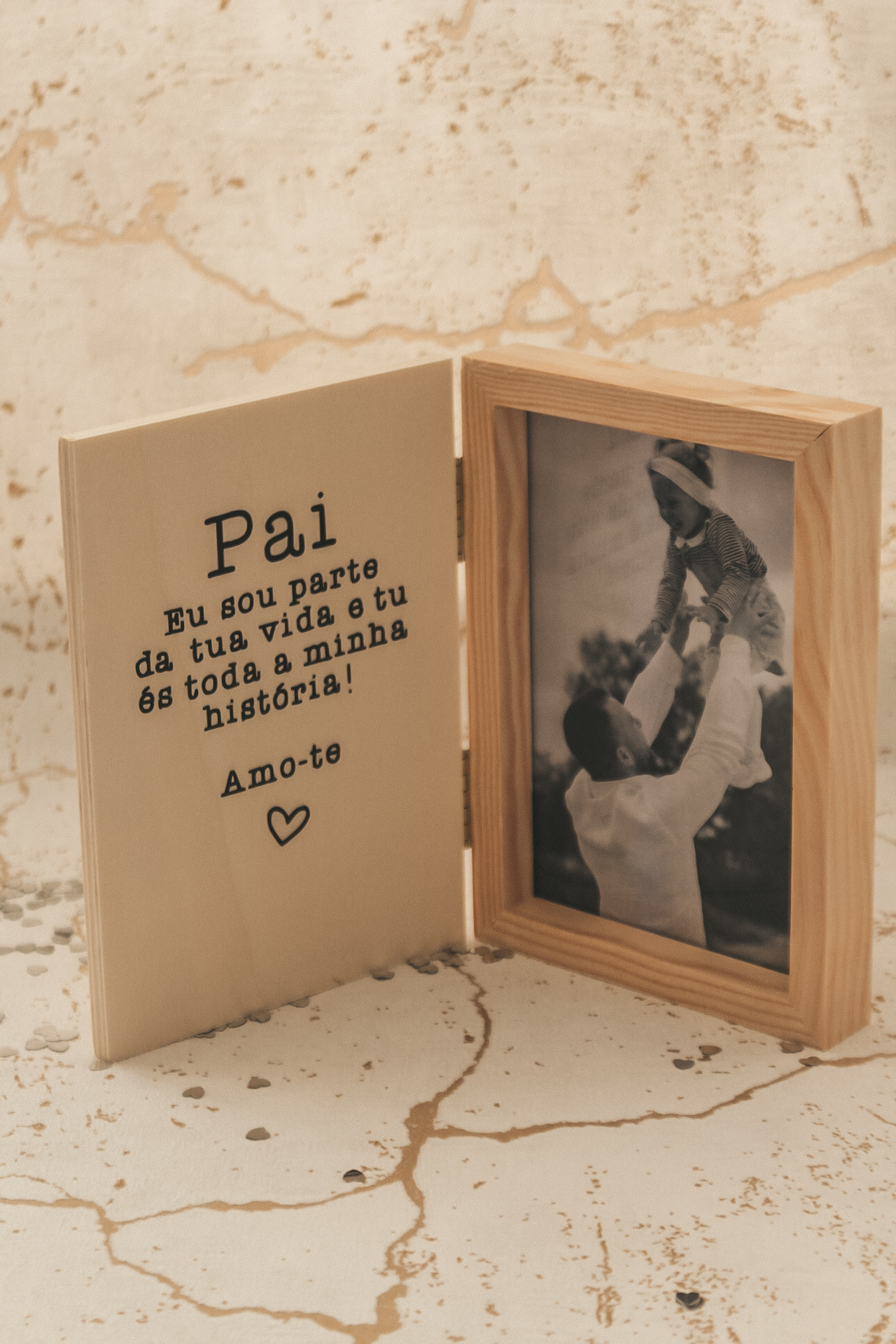 • Objeto de madeira com foto em preto e branco de homem e criança e mensagem escrita em português