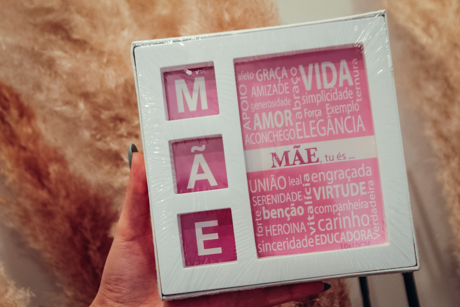 • Caixa branca com placa rosa decorativa com palavras em português sobre mãe.