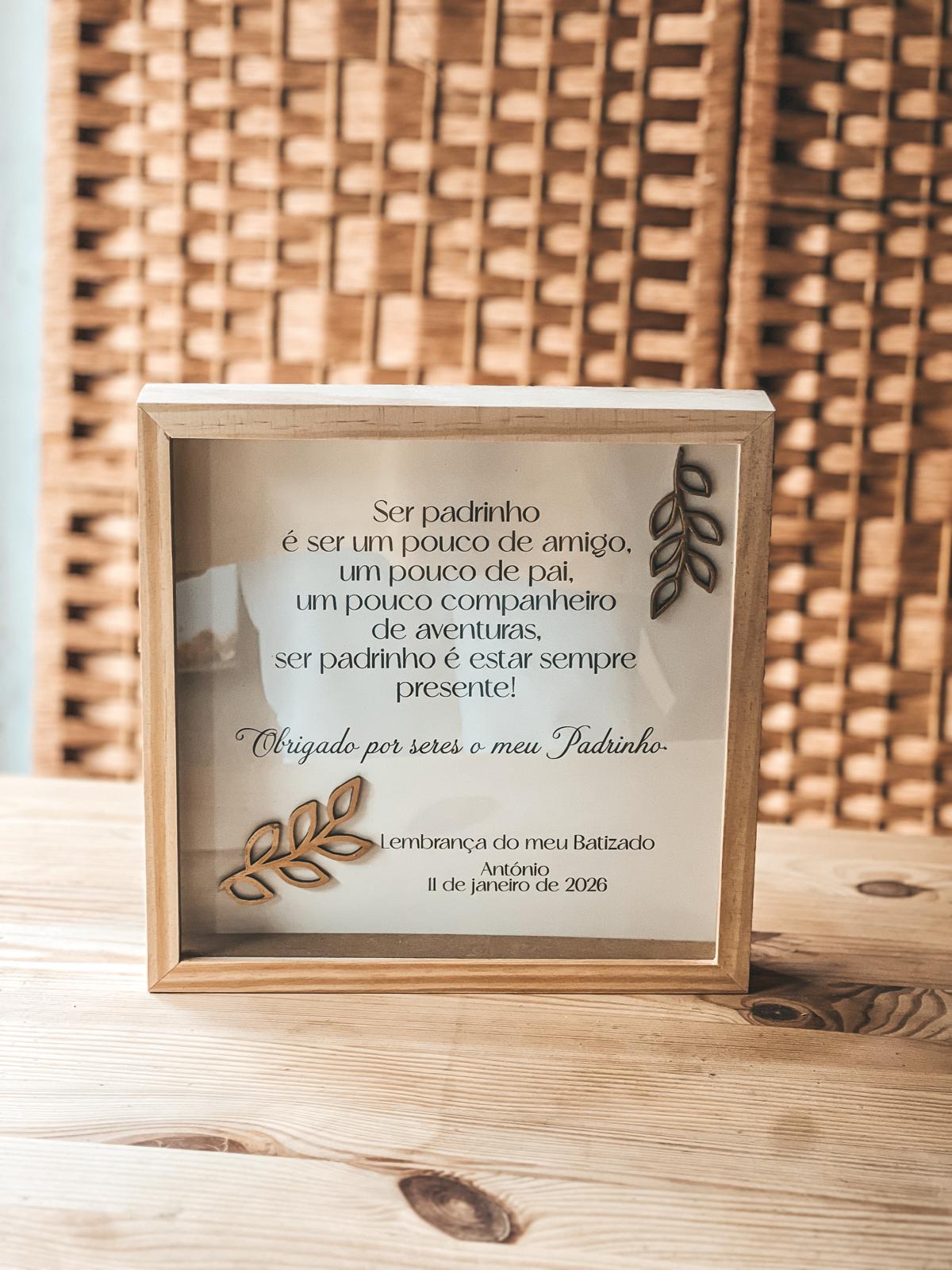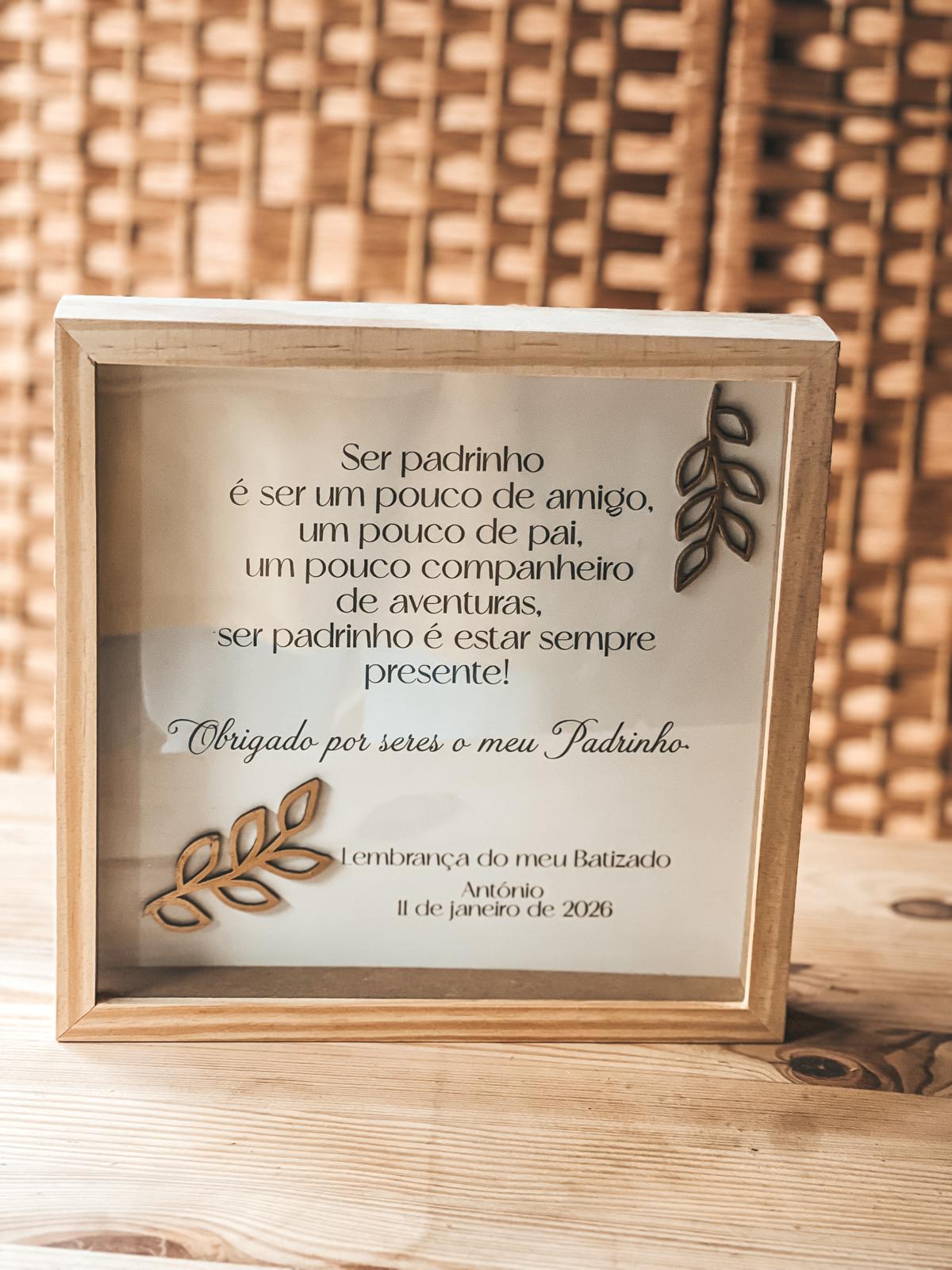 • Placa decorativa de batizado com moldura de madeira clara e texto em português
