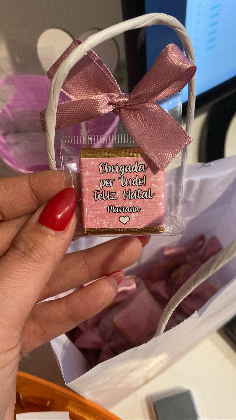 • Mini saco branco com laço rosa contendo chocolate com etiqueta de agradecimento de Natal