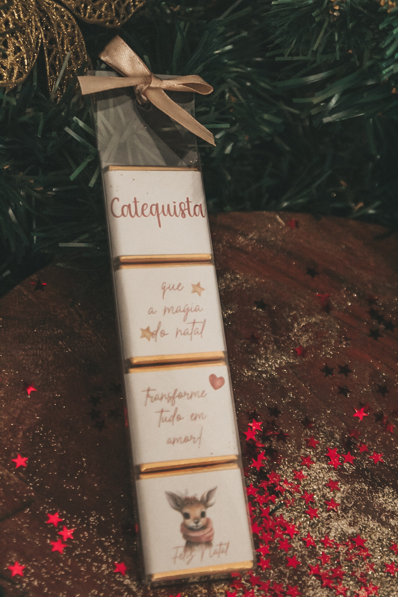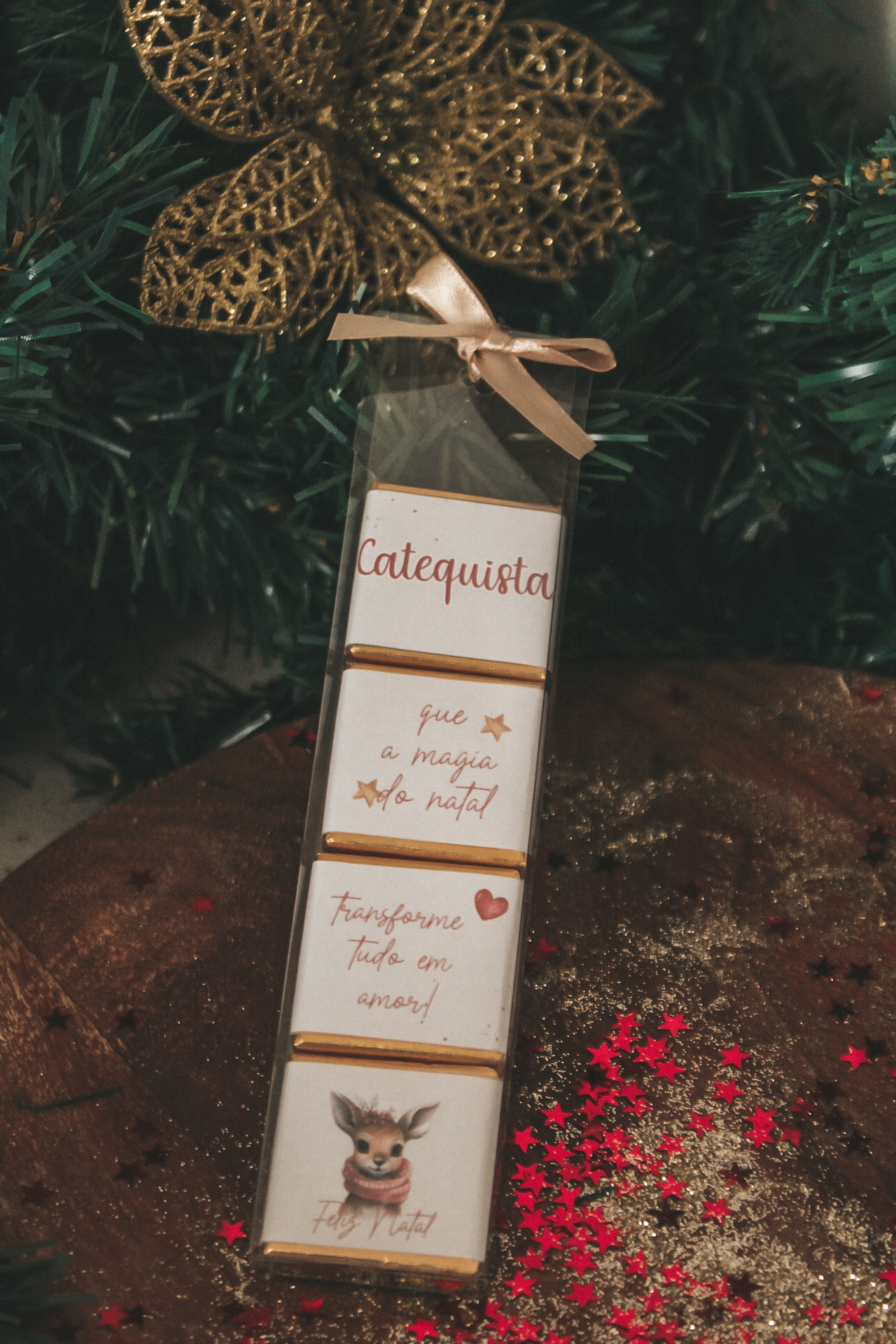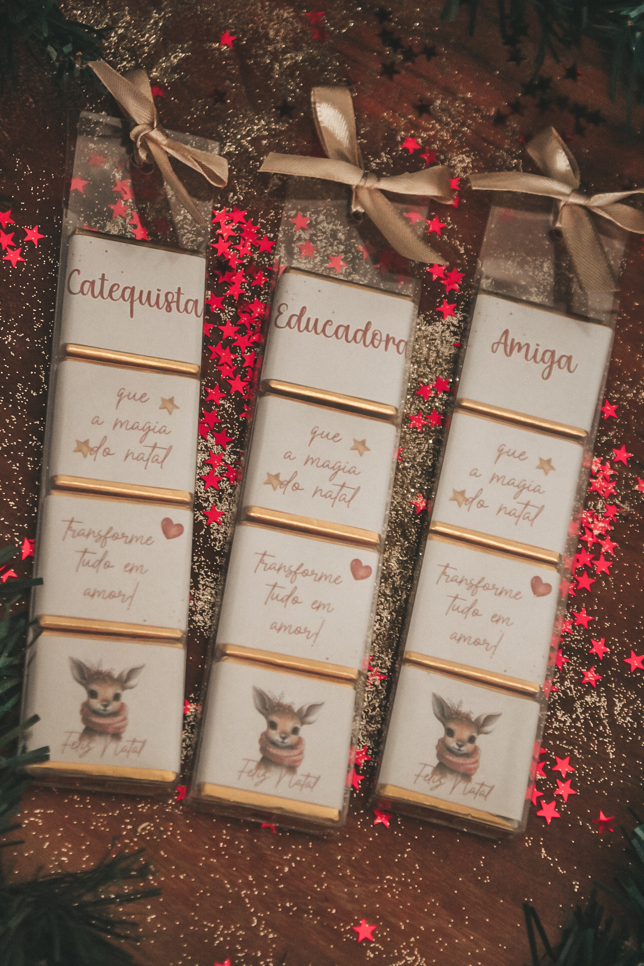 • Pack de chocolates natalícios decorados com mensagens em português e imagem de veado, em embalagem transparente com fita rosa, sobre madeira com glitter e estrelas vermelhas, perto de decoração de Natal verde com borboleta dourada.