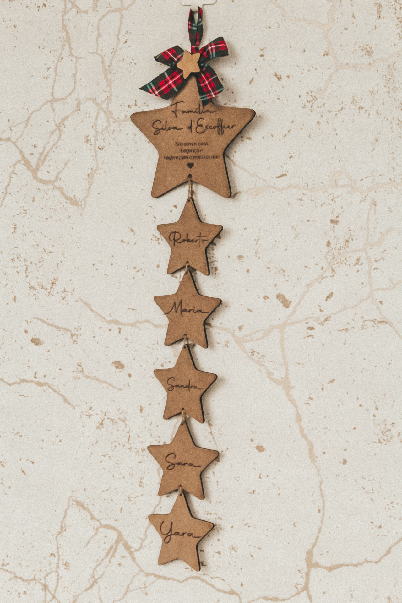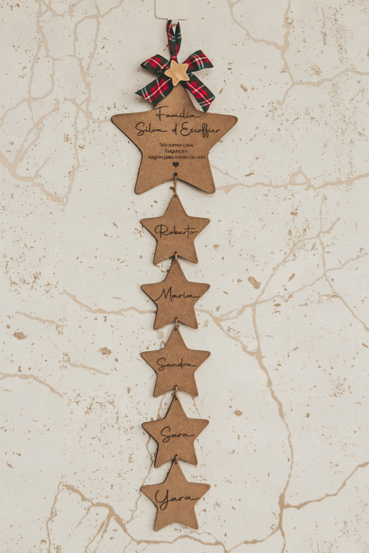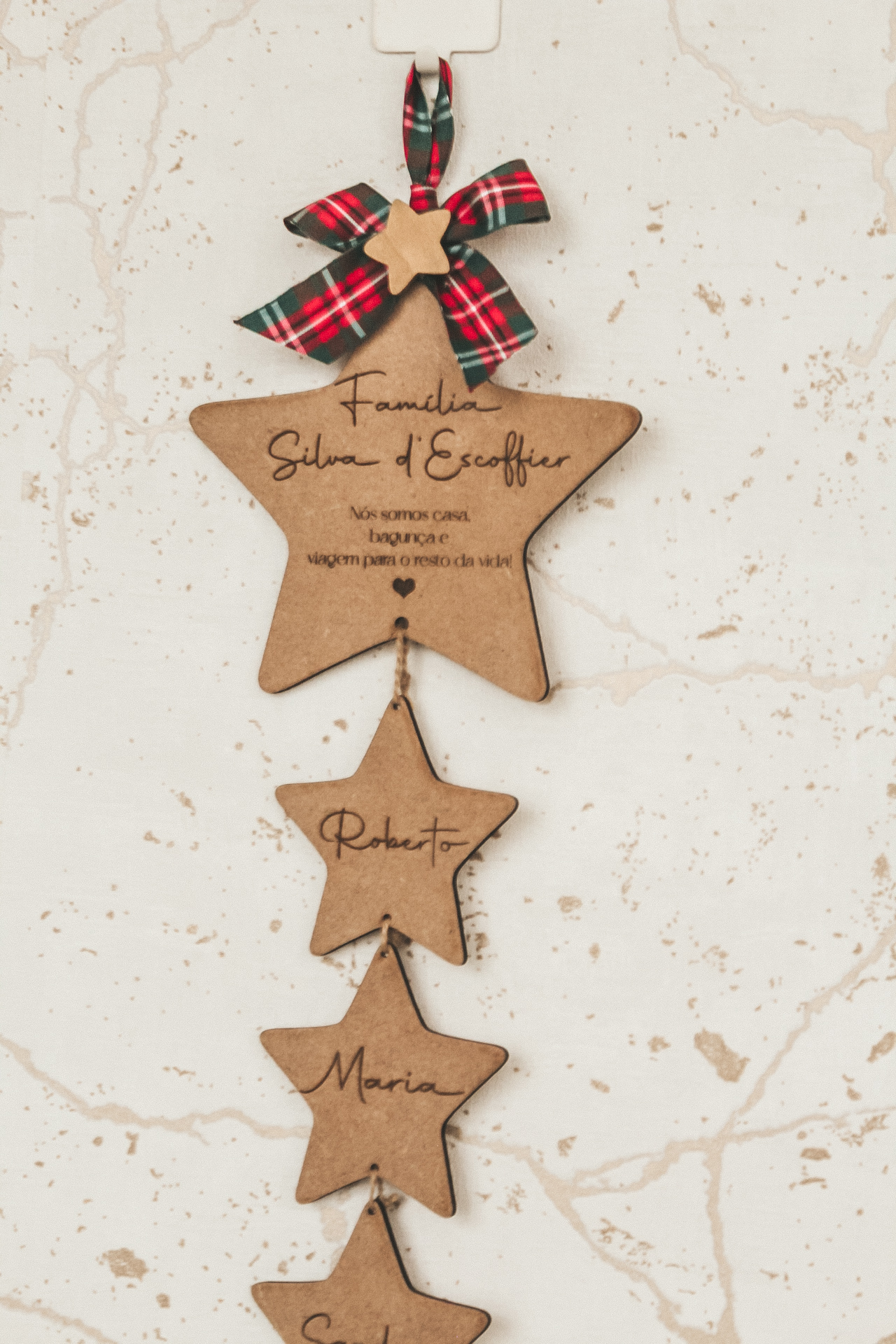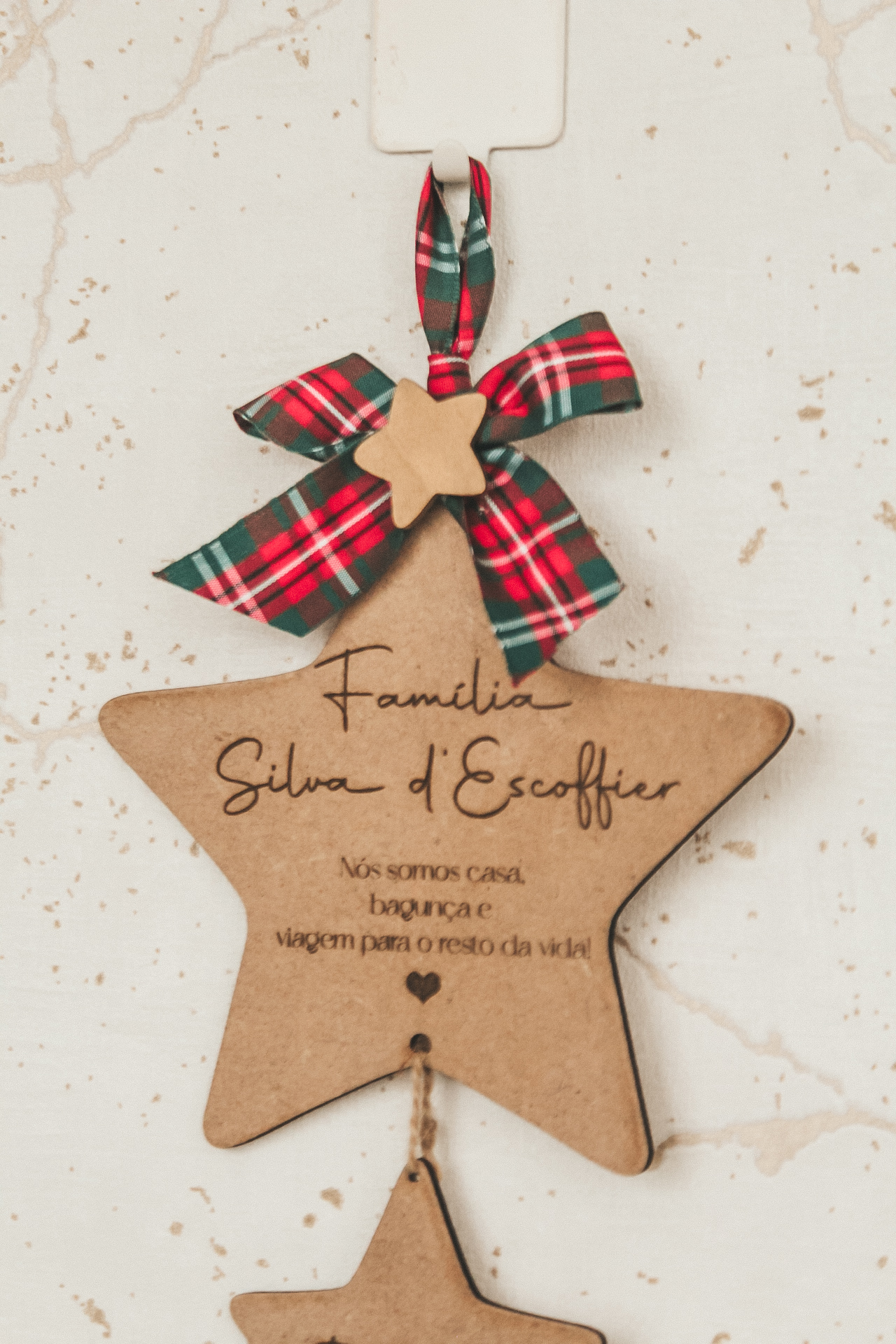 • Estrela decorativa de madeira com laço xadrez e texto gravado pendurada