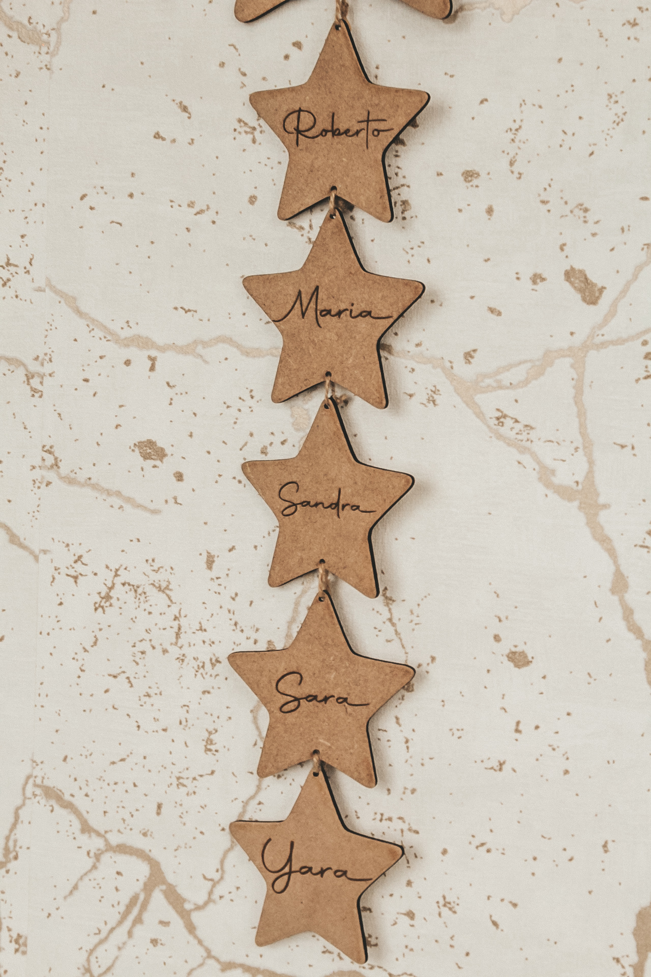 • Estrelas de cortiça com nomes escritos à mão penduradas por um fio