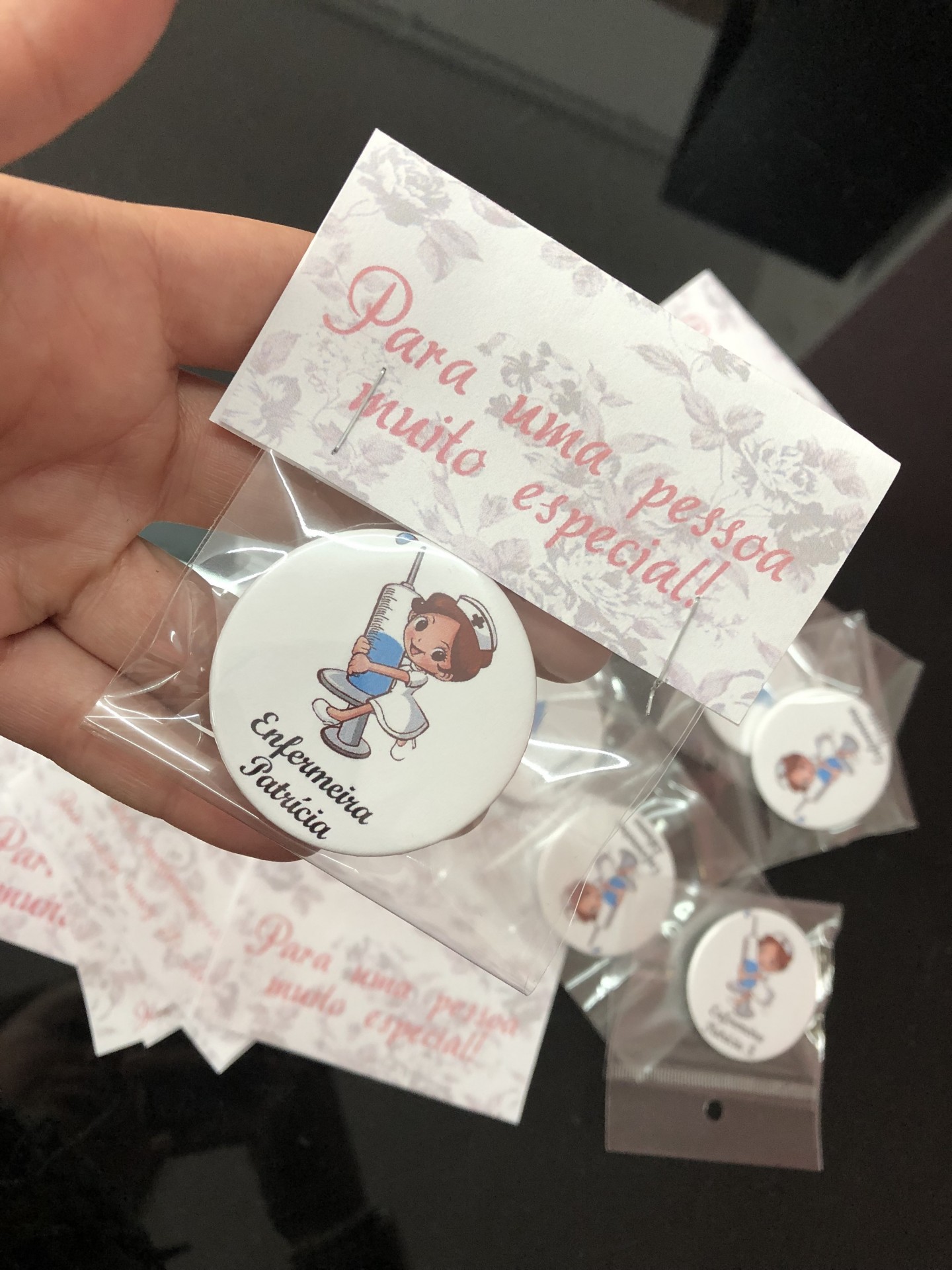 • Botão redondo com desenho de enfermeira e texto em embalagem com etiqueta floral