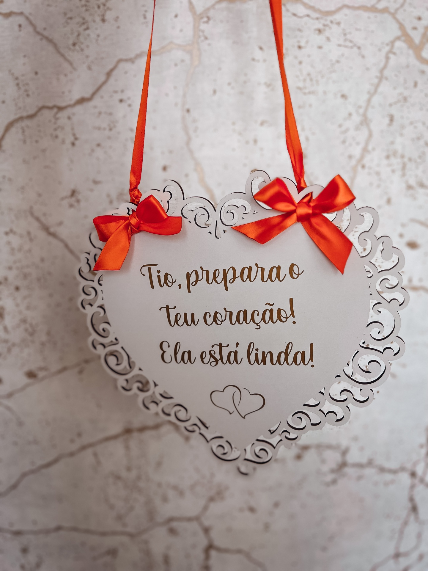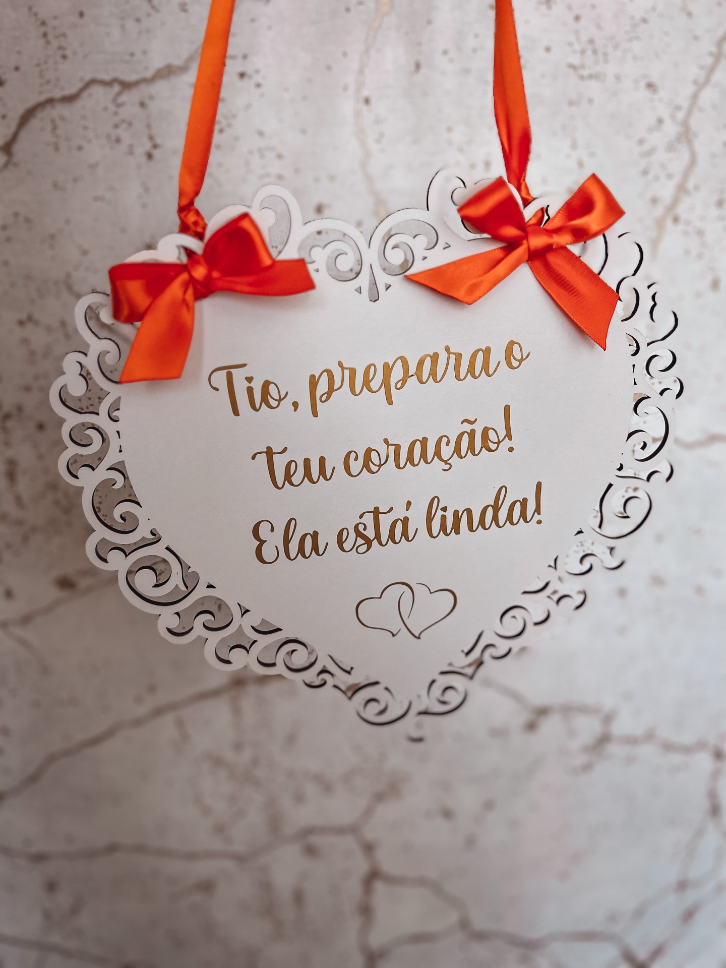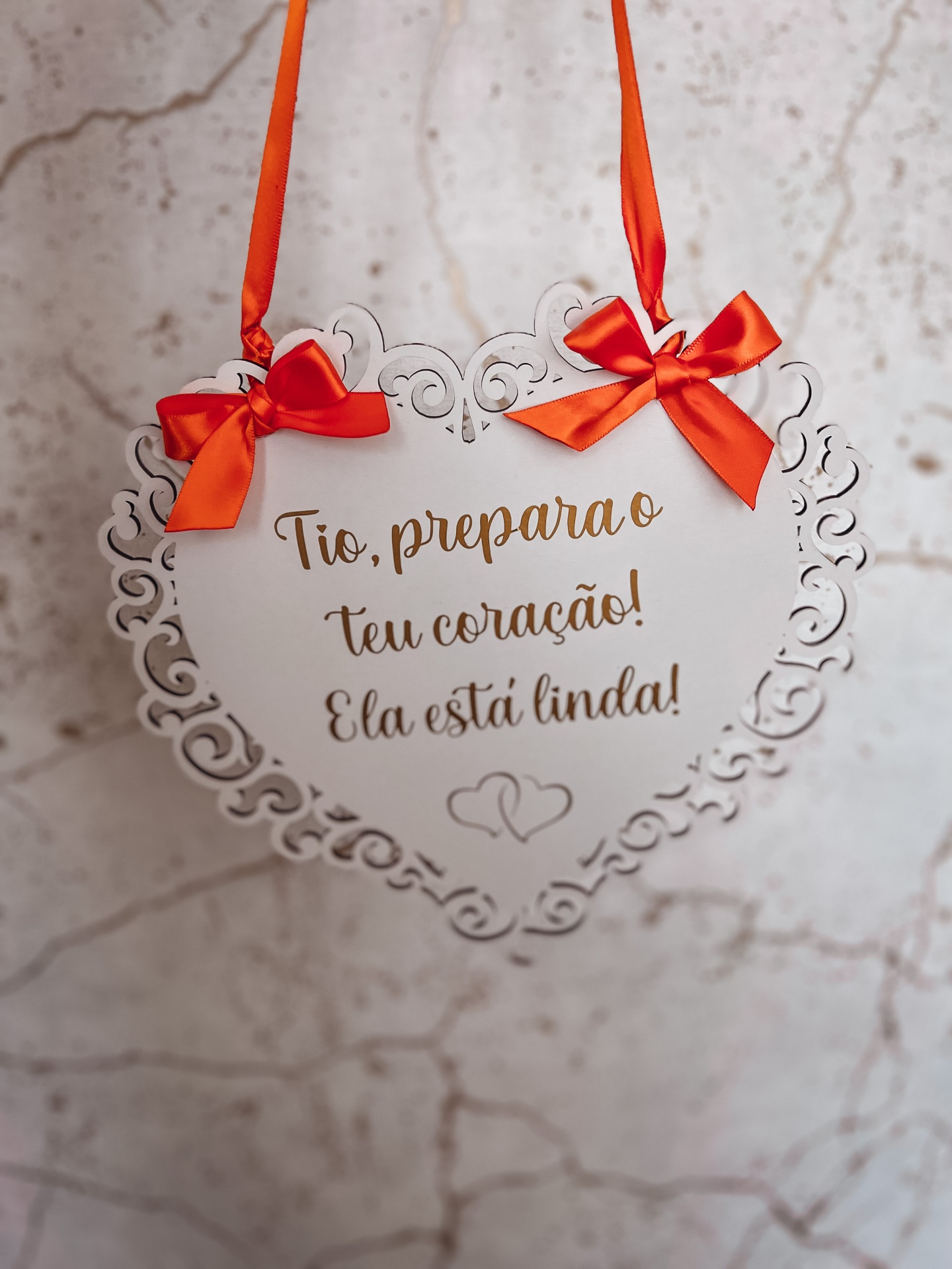 • Placa coração branca com texto dourado e fitas laranja decorativas