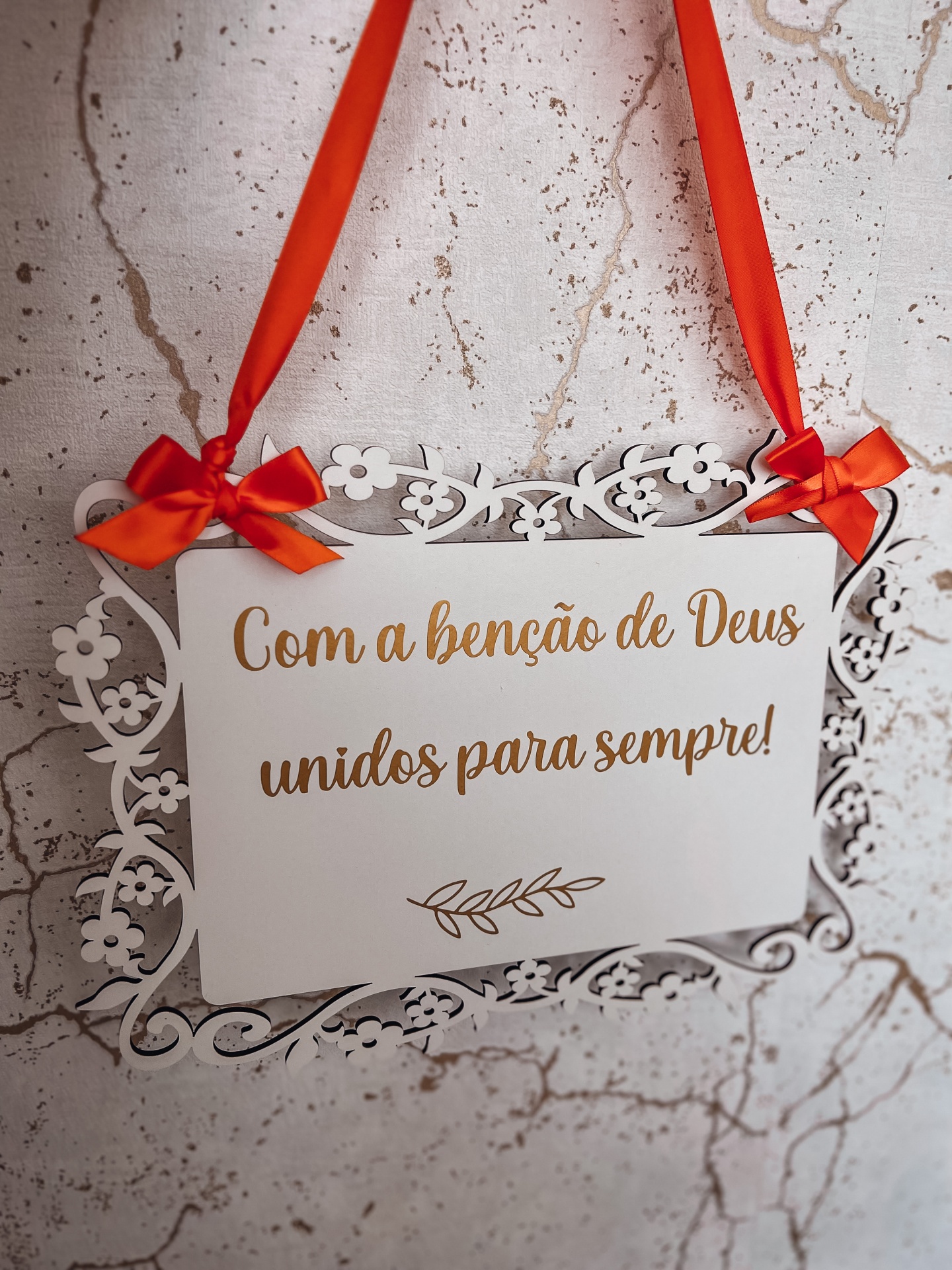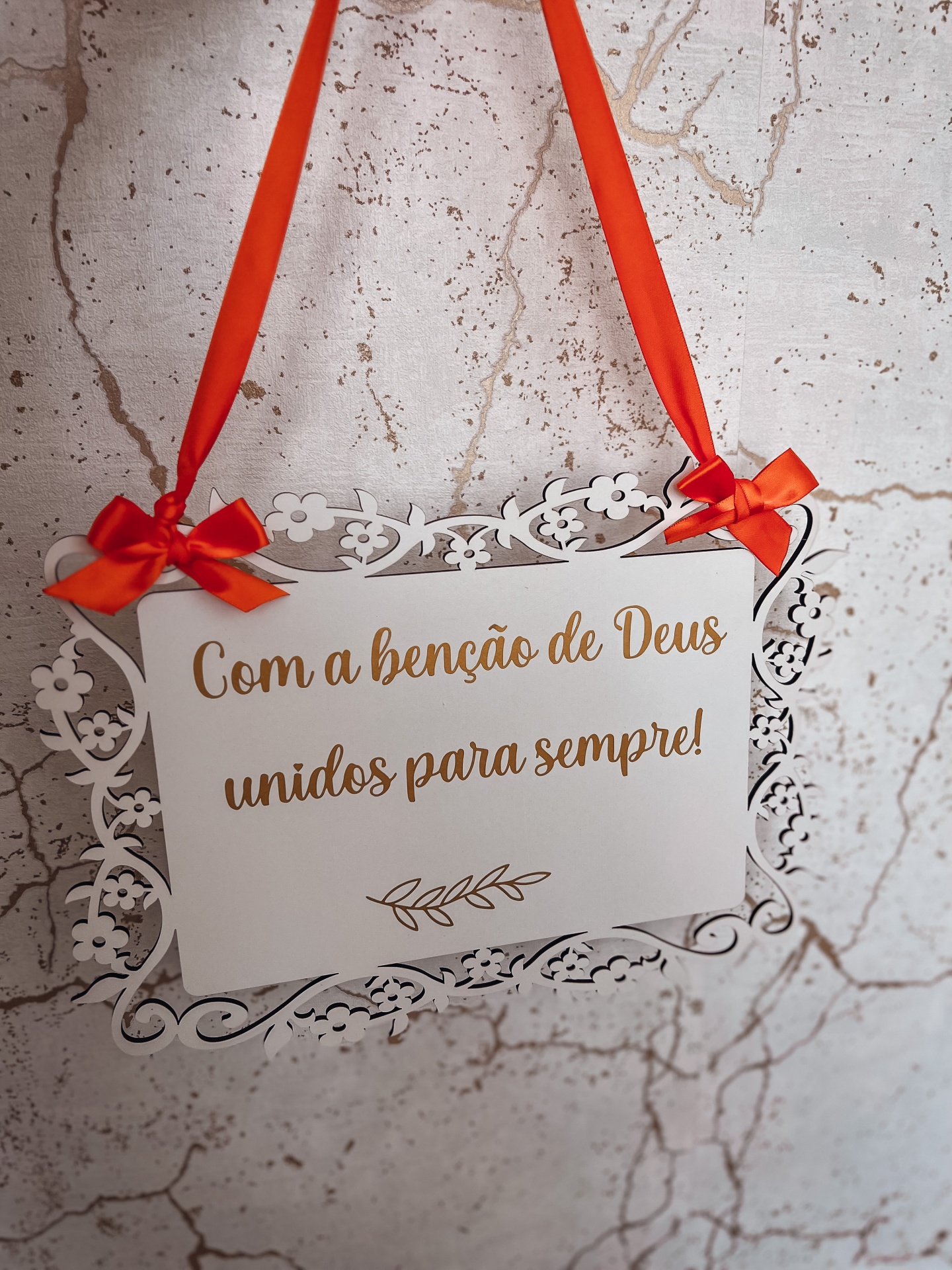 • Placa decorativa branca com texto dourado e fita laranja pendurada na parede