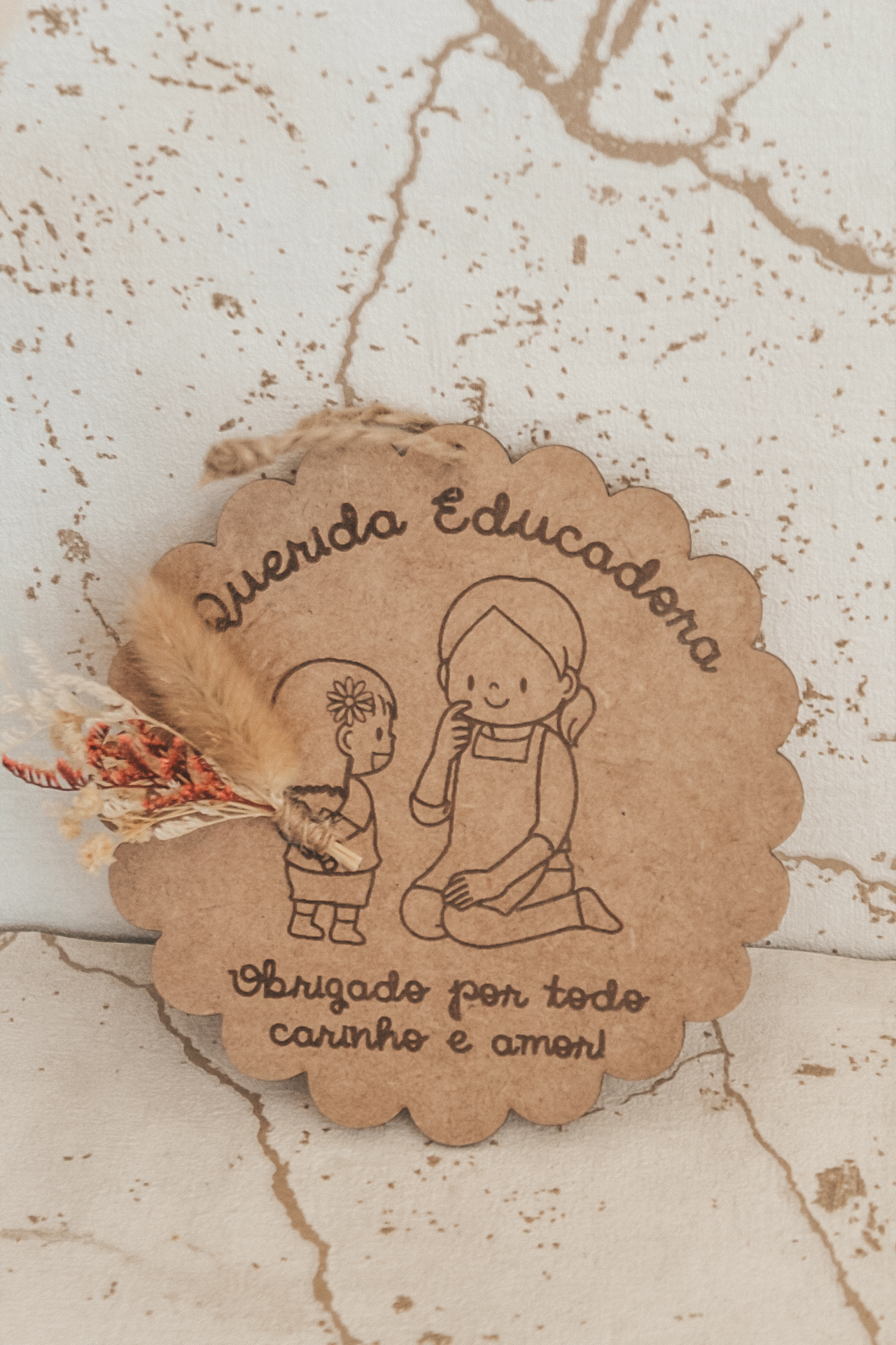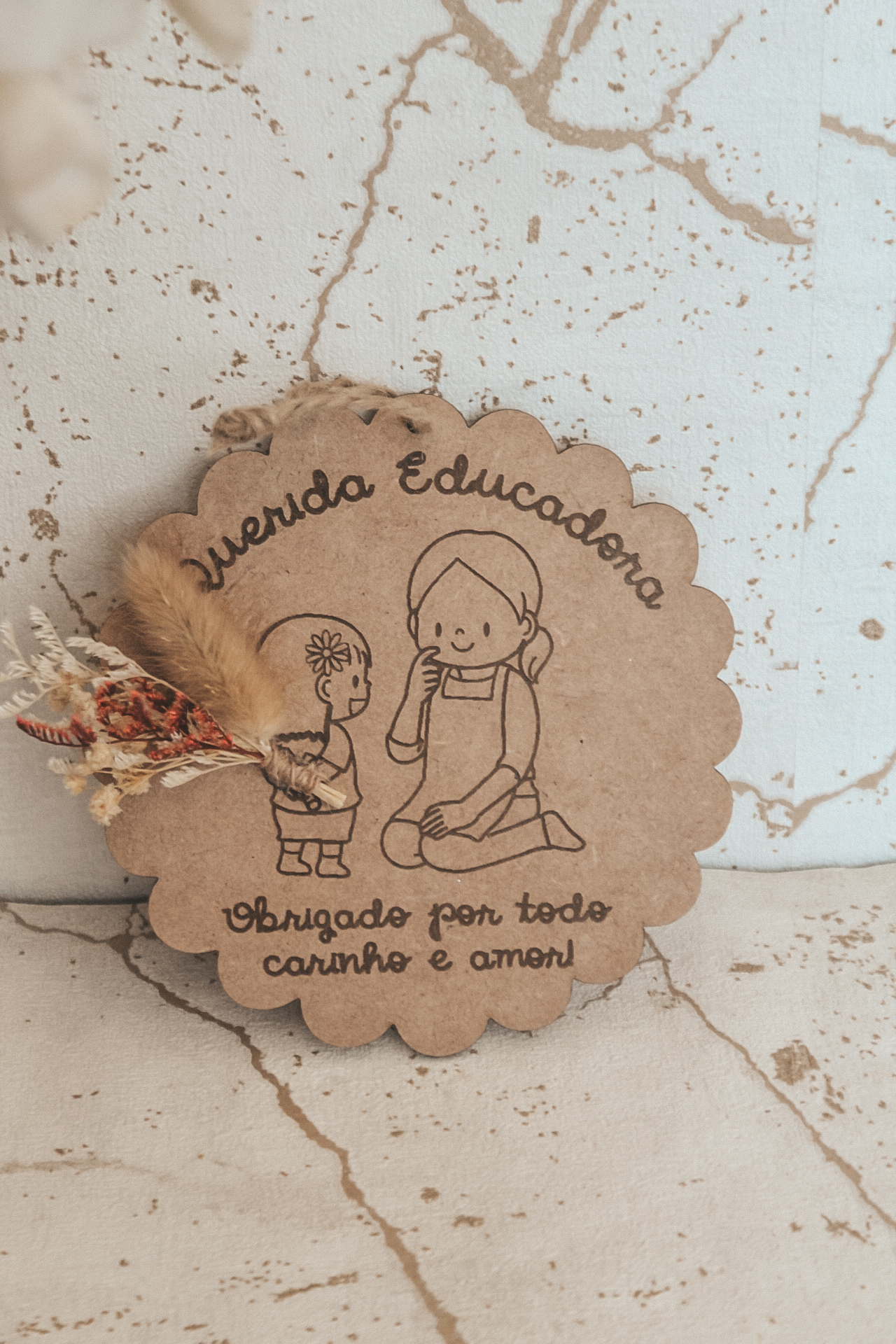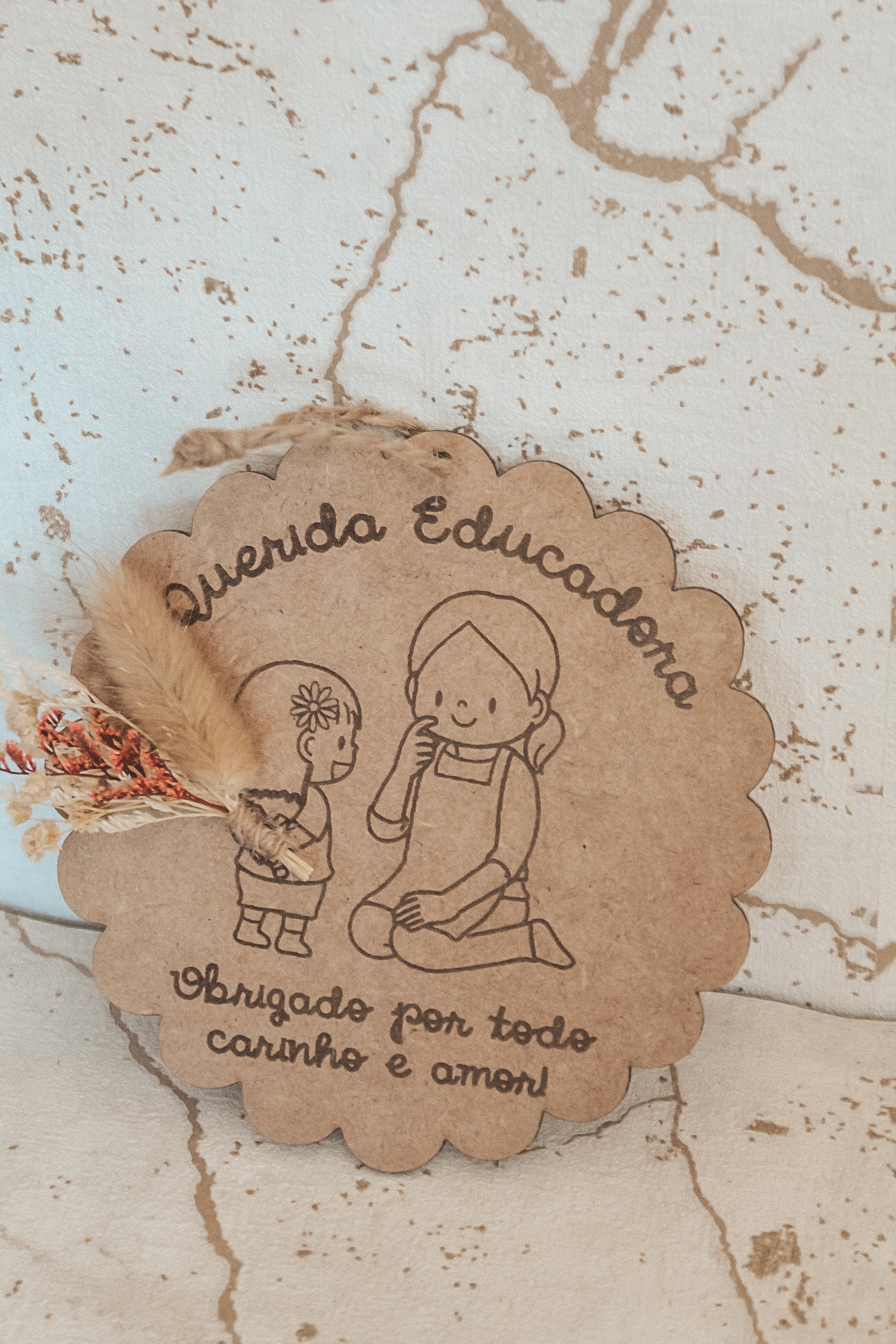 • Placa decorativa em madeira com mensagem para educadora e flores secas