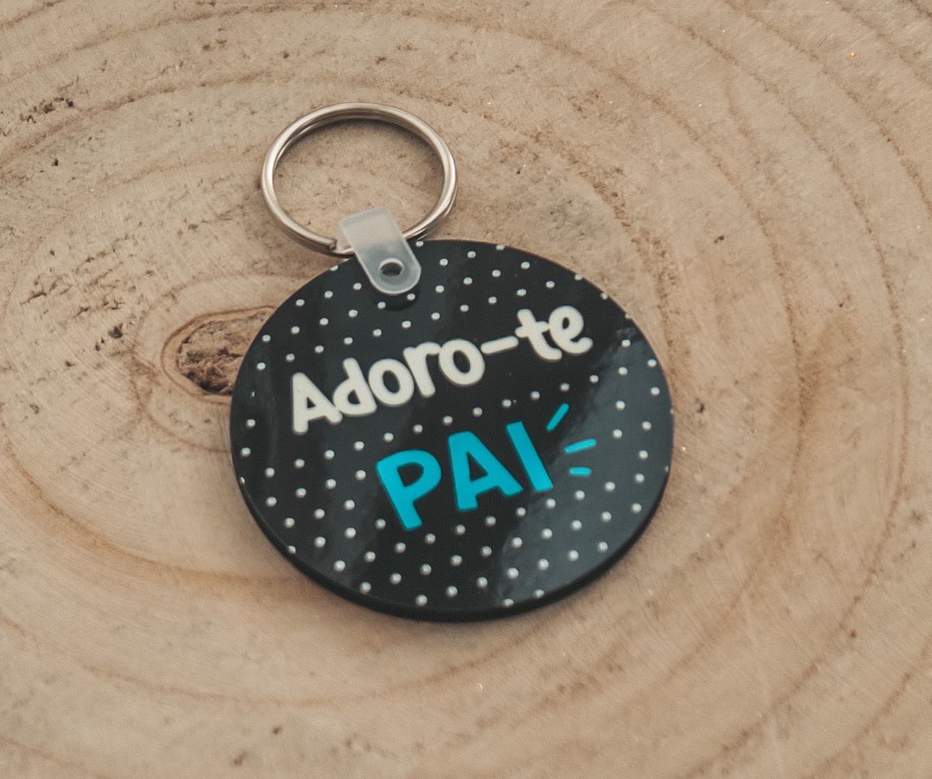 • Chaveiro redondo preto com bolinhas brancas e texto 'Adoro-te PAI'