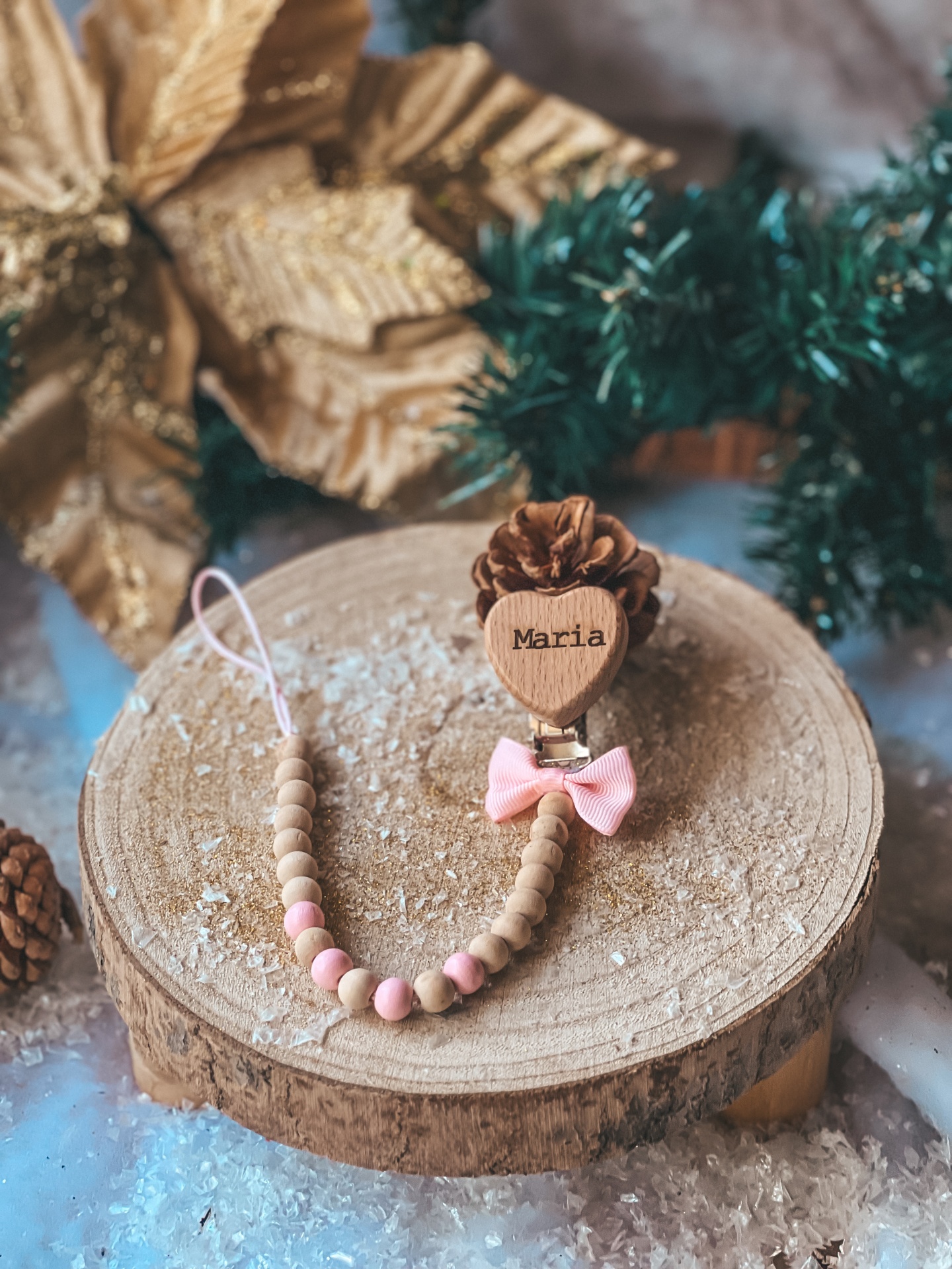 • Clipe de madeira com nome Maria e cordão de contas rosa e naturais