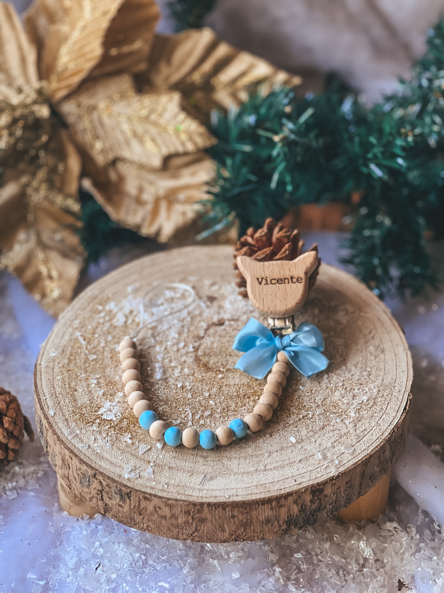 • Presilha de madeira personalizada com contas de madeira naturais e azuis sobre um tronco de madeira redondo