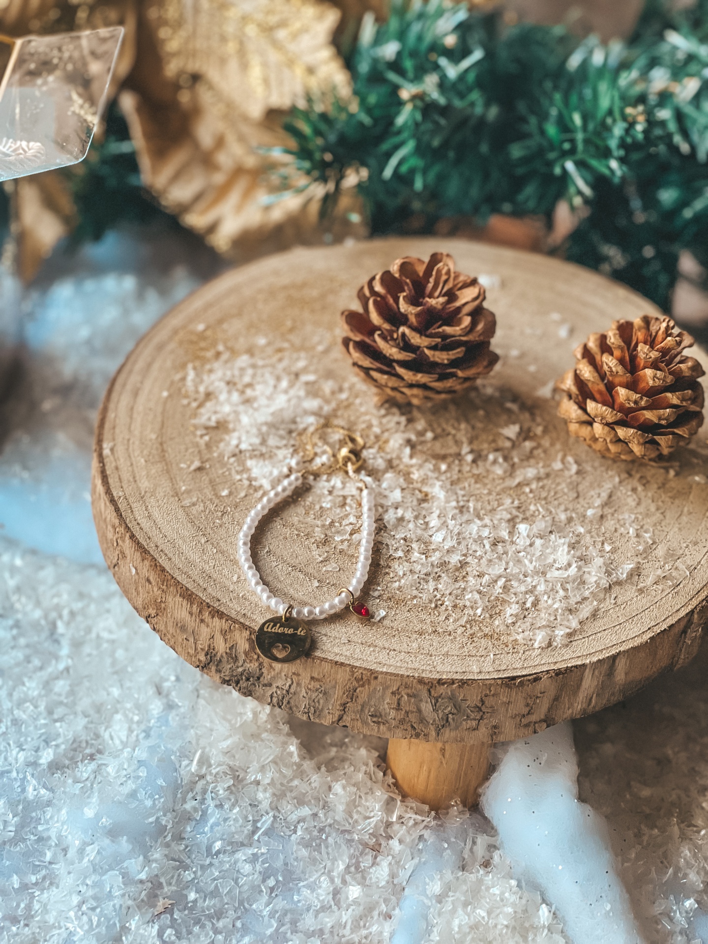 • Pulseira de pérolas com pendente dourado e pinhas sobre base de madeira com neve artificial
