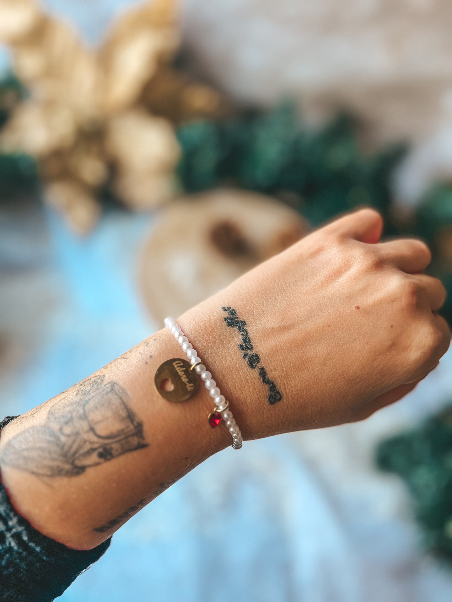• Pulseira de pérolas brancas com pingentes dourados e um coração vermelho no pulso de mão tatuada