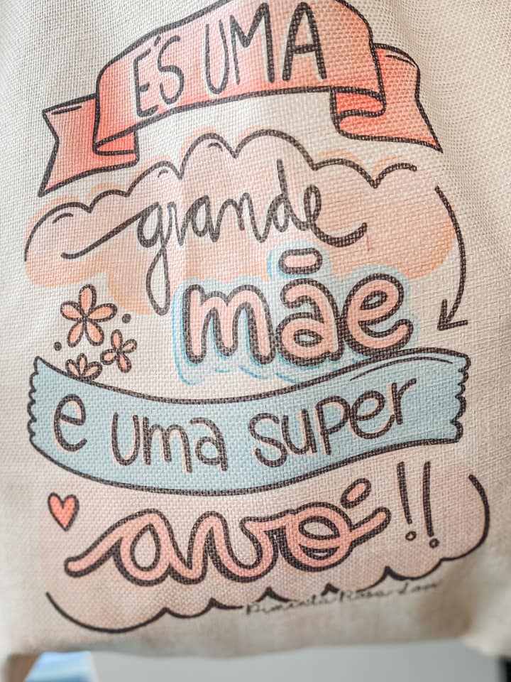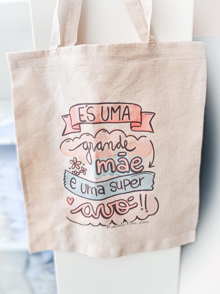 • Saco de tecido bege com texto colorido que diz ÉS UMA grande mãe e uma super avó!!