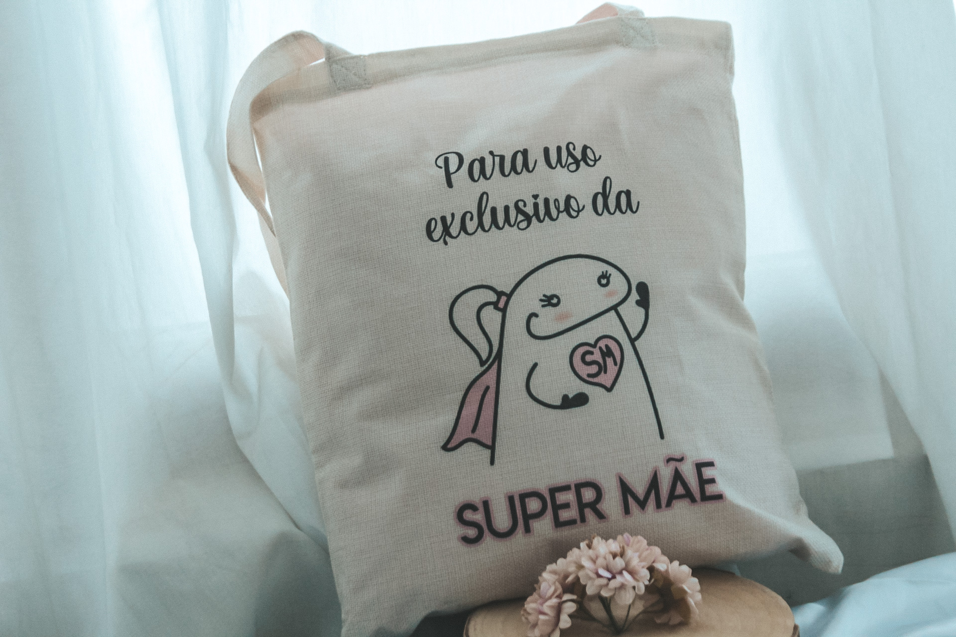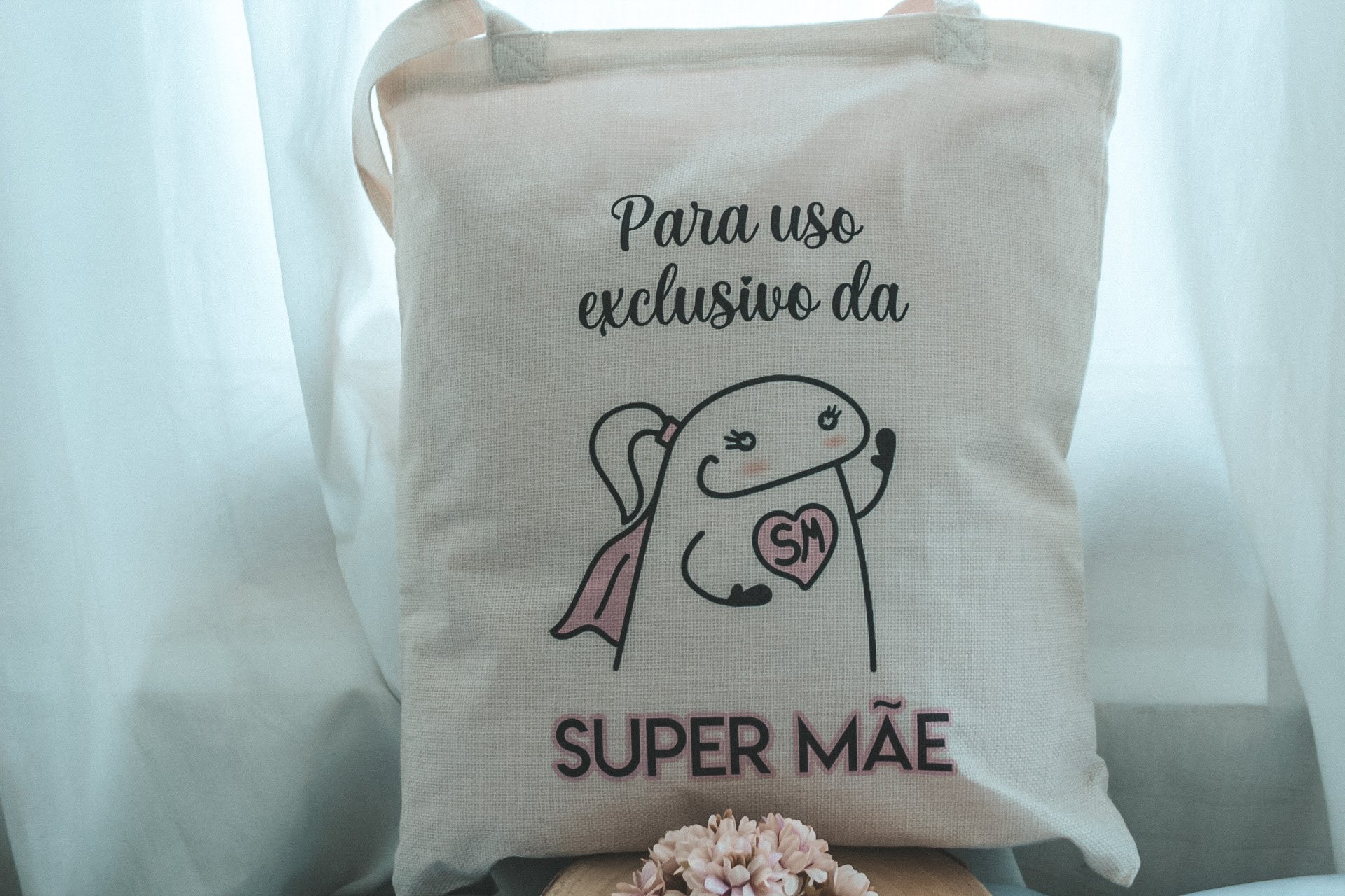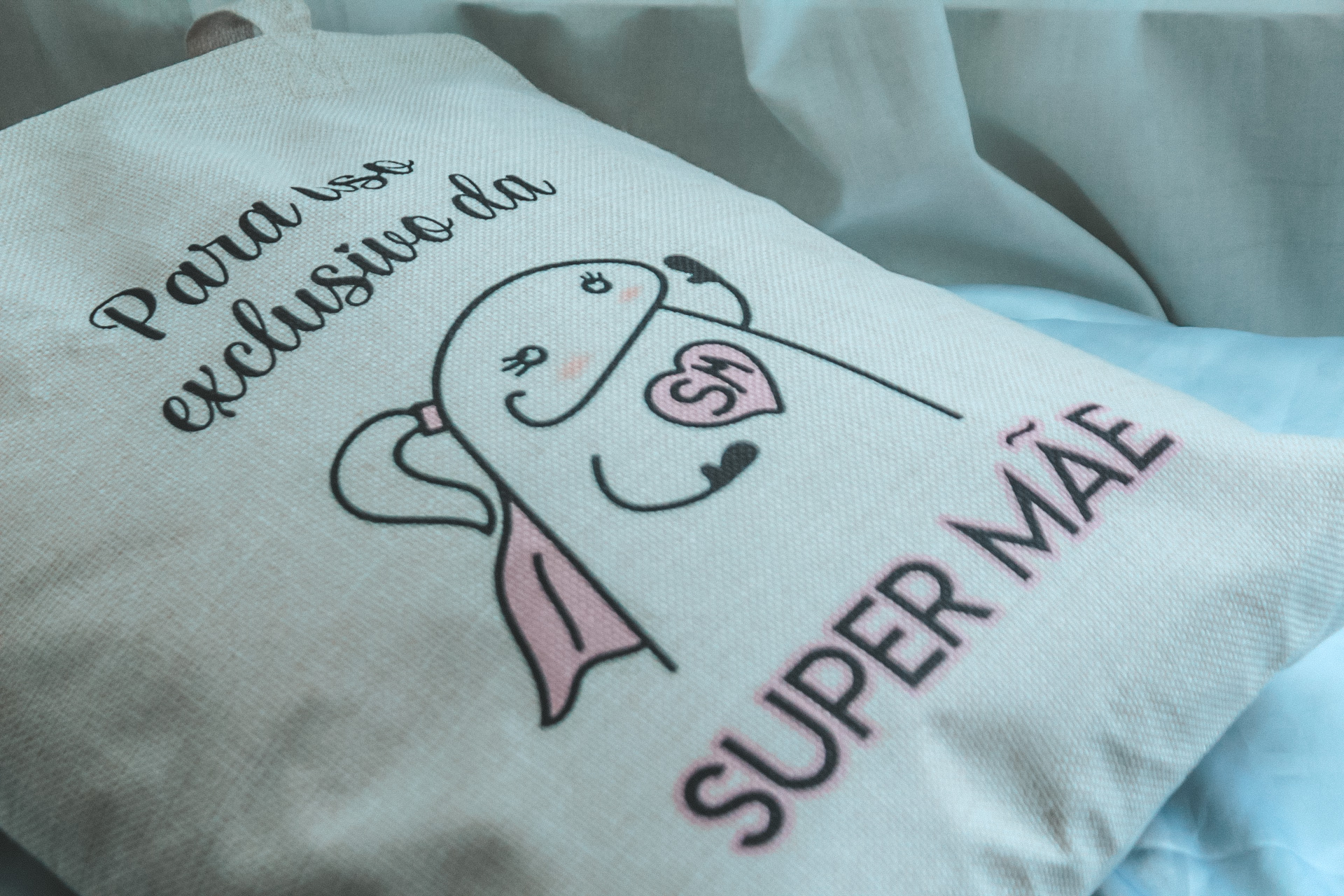 • Saco de tecido com desenho e texto para uso exclusivo da super mãe