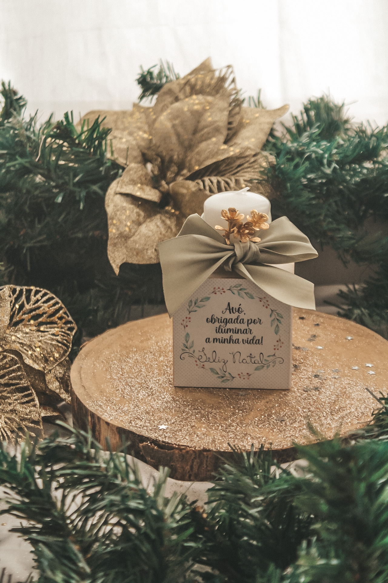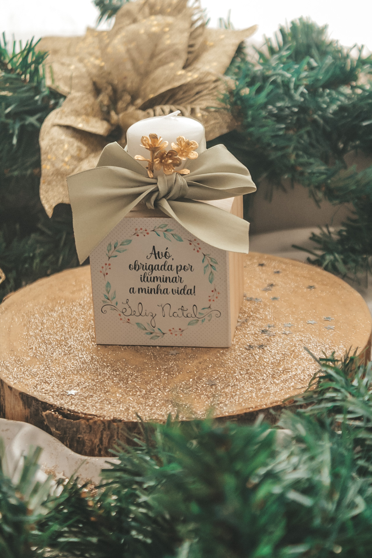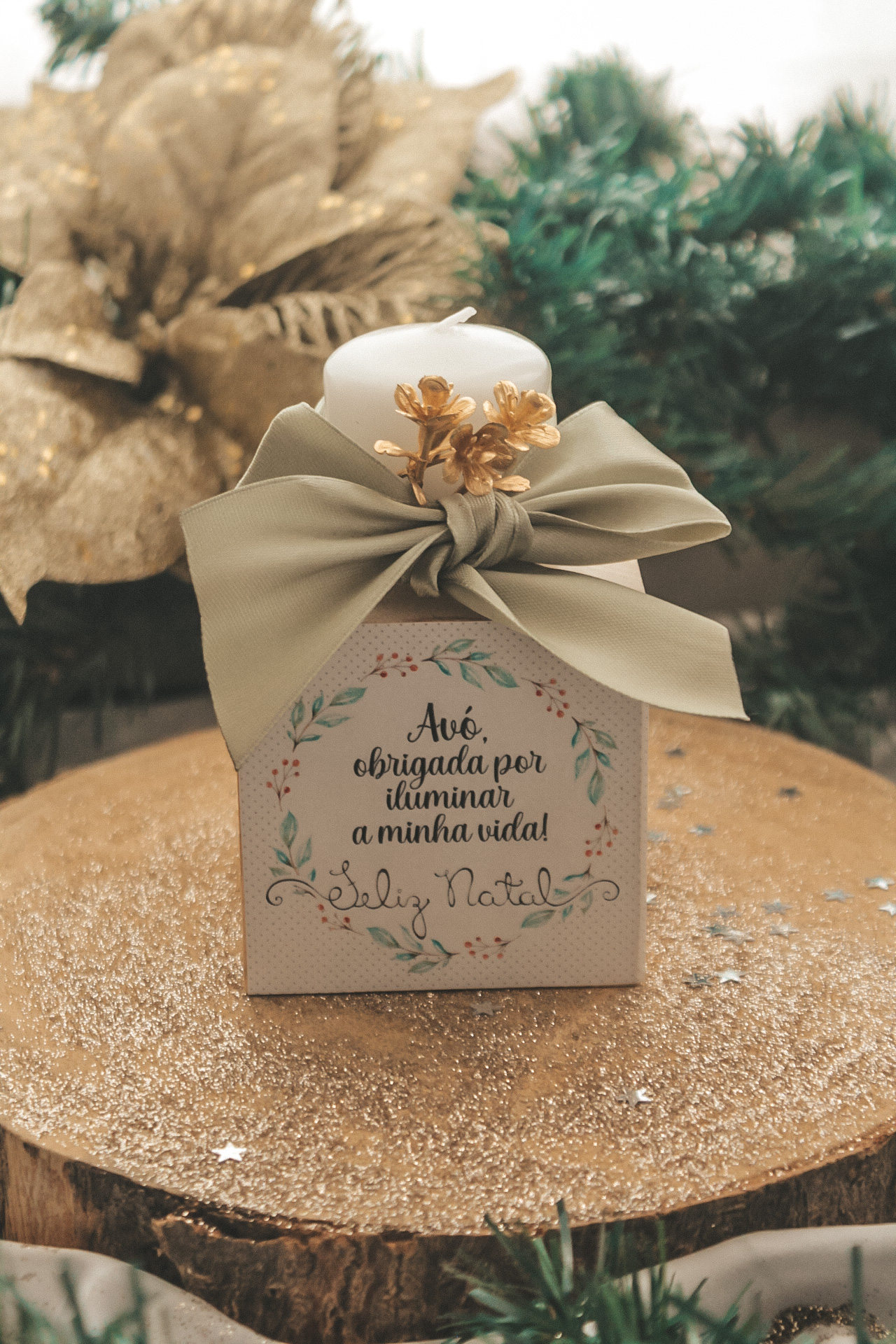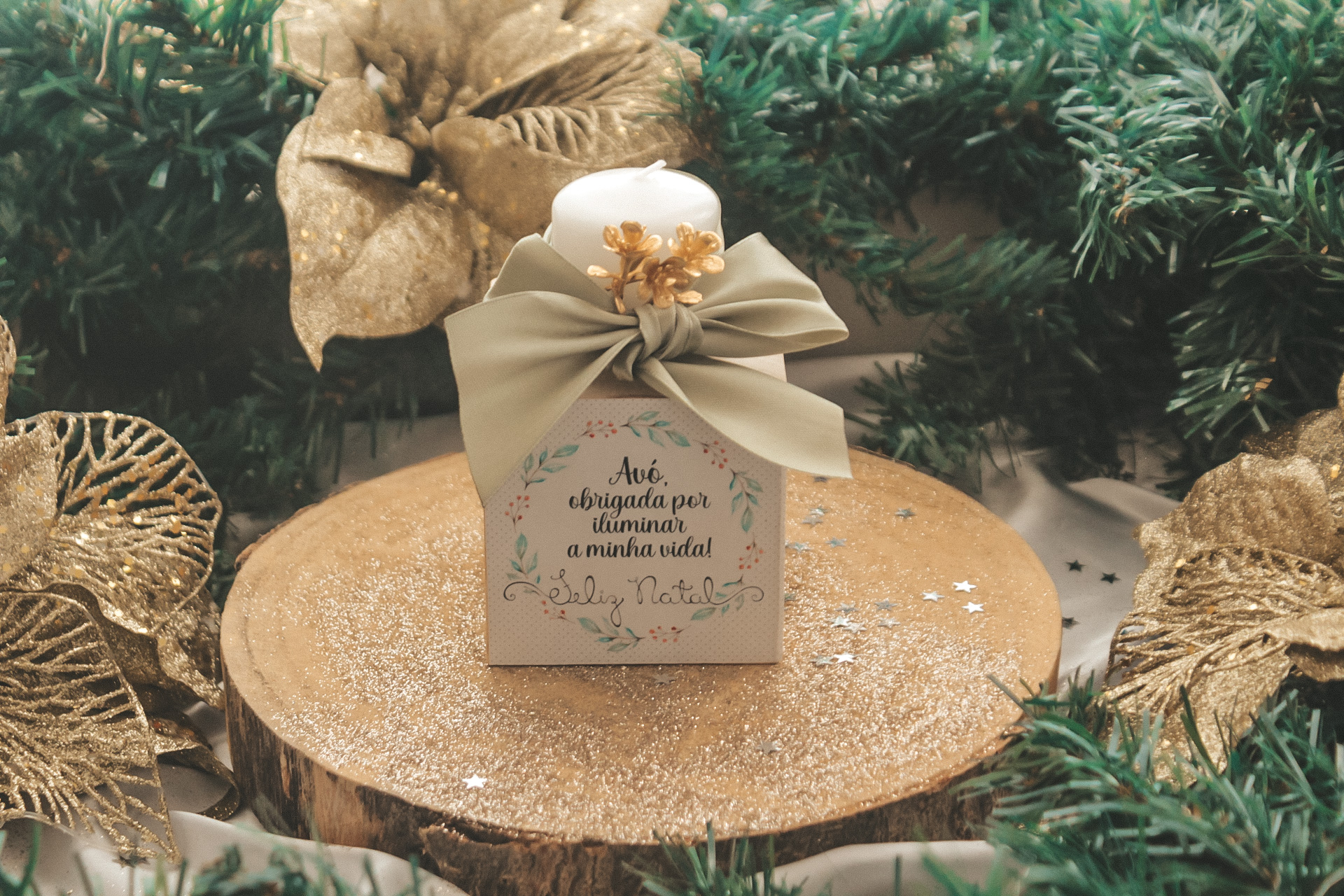 • vela branca decorativa com laço verde e flores douradas em caixa com texto de Natal