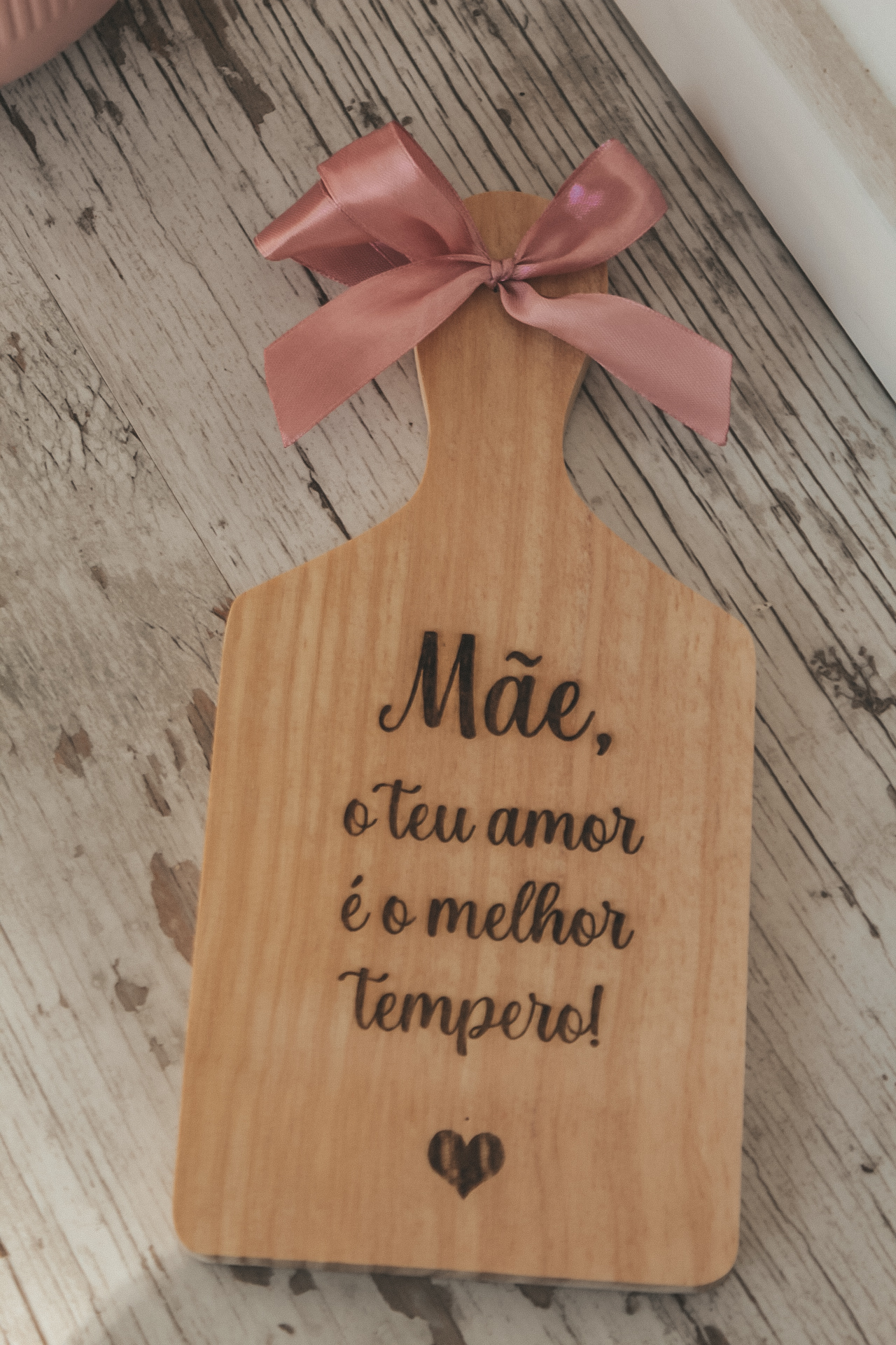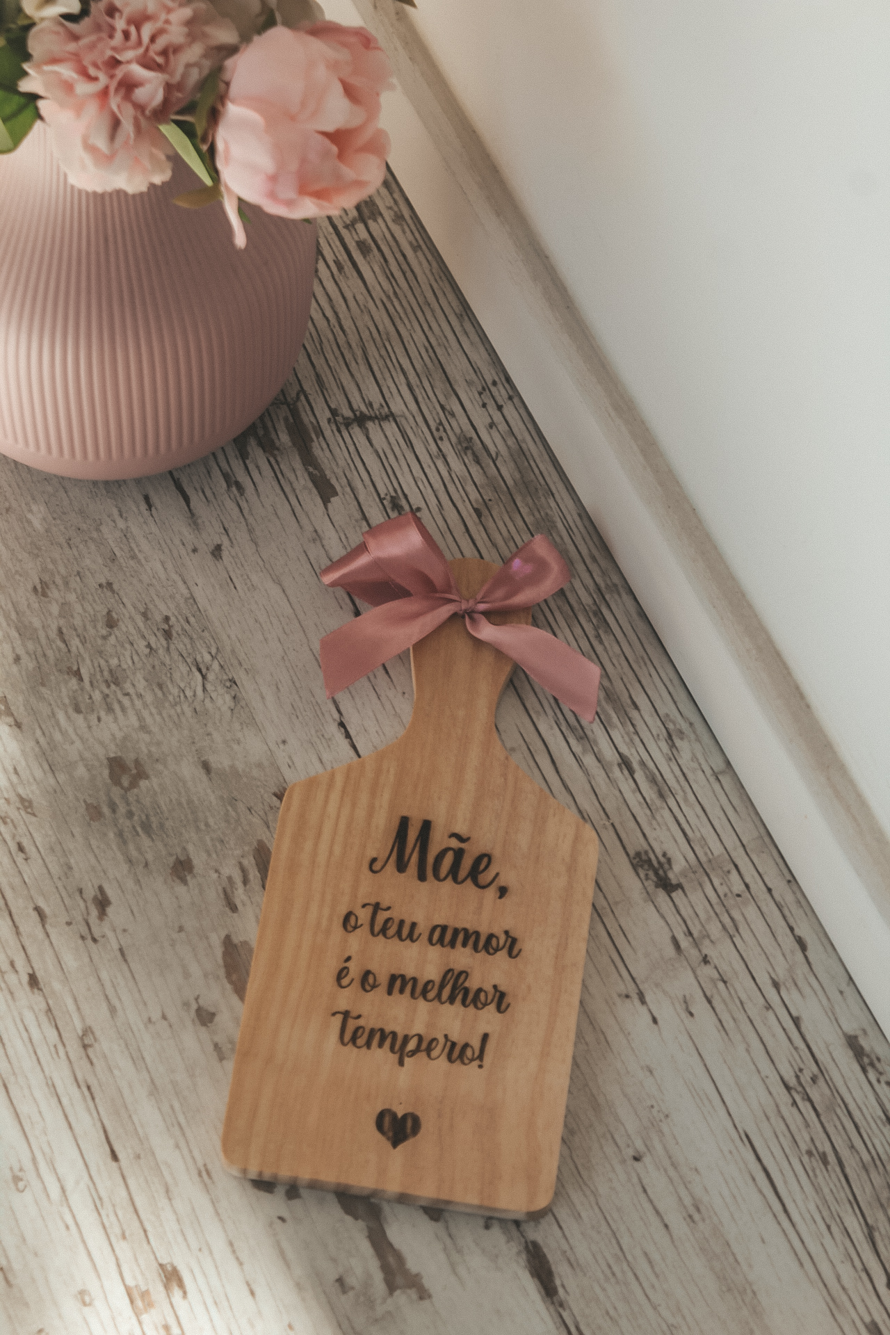 • Tábuinha de madeira com mensagem para mãe e laço rosa